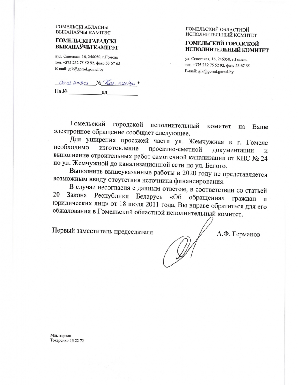 Выполнить изготовление проектно-сметной документации и строительные работы самотечной канализации от КНС №24 по ул.Жемчужной до канализационной сети по ул.Белого в 2020 г. не представляется возможным ввиду отсутствия финансирования.
