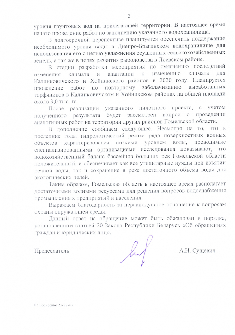 В деревнях региона, по нашим наблюдениям, вымерли лягушки и жабы, уходят из деревень ближе к долинам Днепра и Припяти аисты. Сегодня уровень грунтовых вод в регионе, по нашим данным, на 1,5-2 метра ниже, чем в 1990-е годы, исчезает вода в сельских колодцах. Регион в летний период из года в год находится в пожароопасном состоянии, когда нет воды и пожары гасить просто нечем. Массово засыхают леса: сосна, осина, берёза, происходит опустынивание региона.