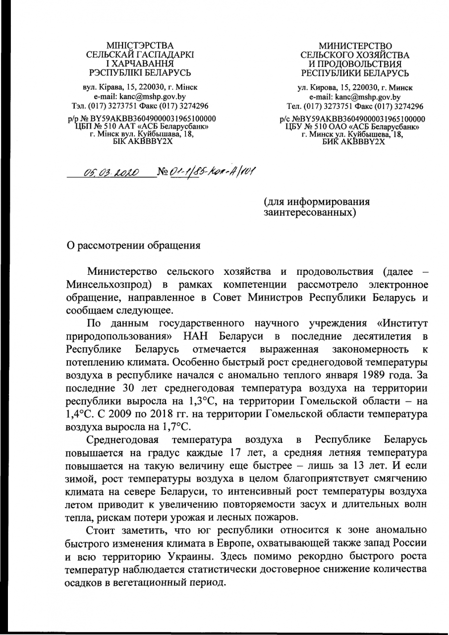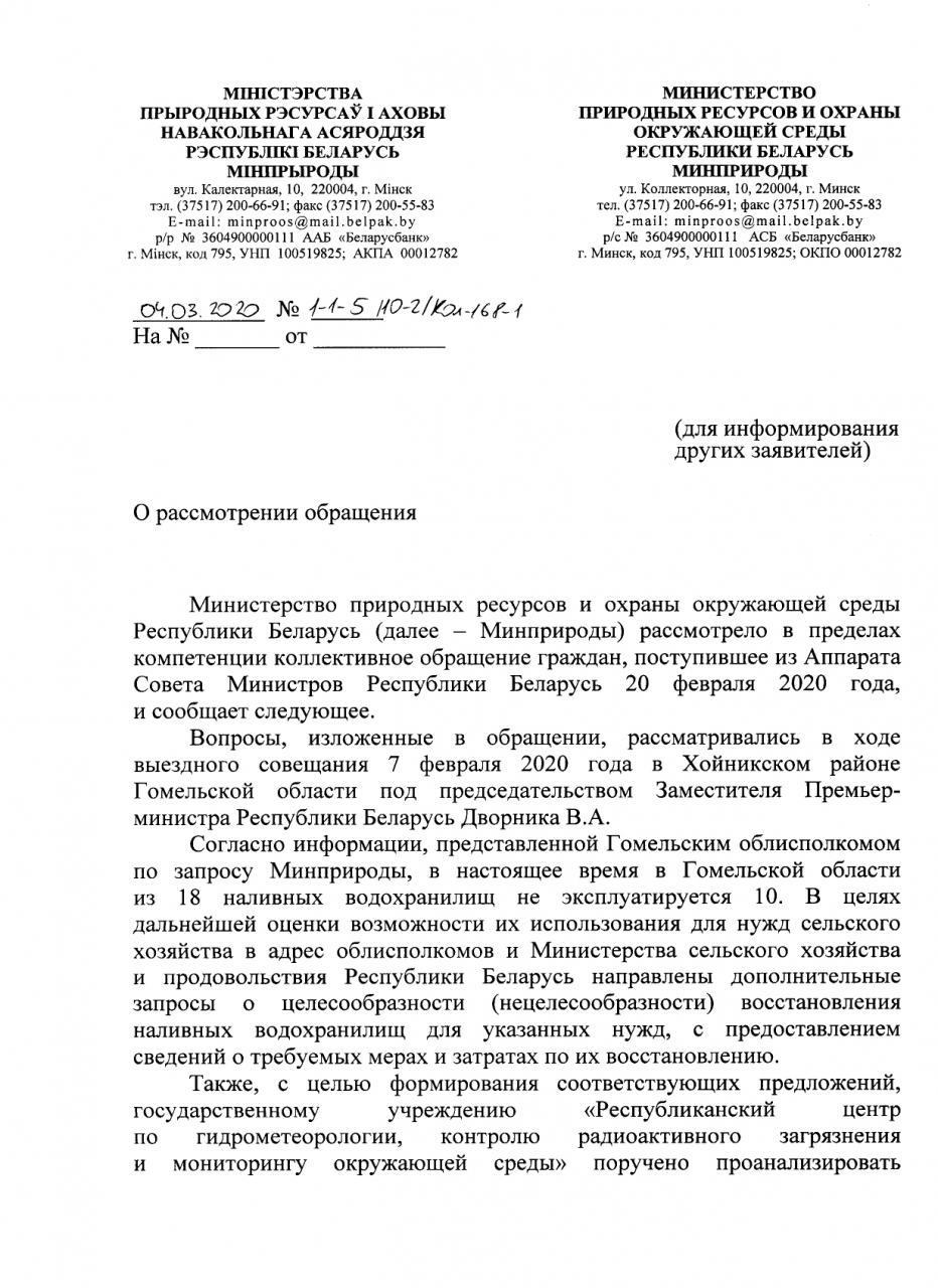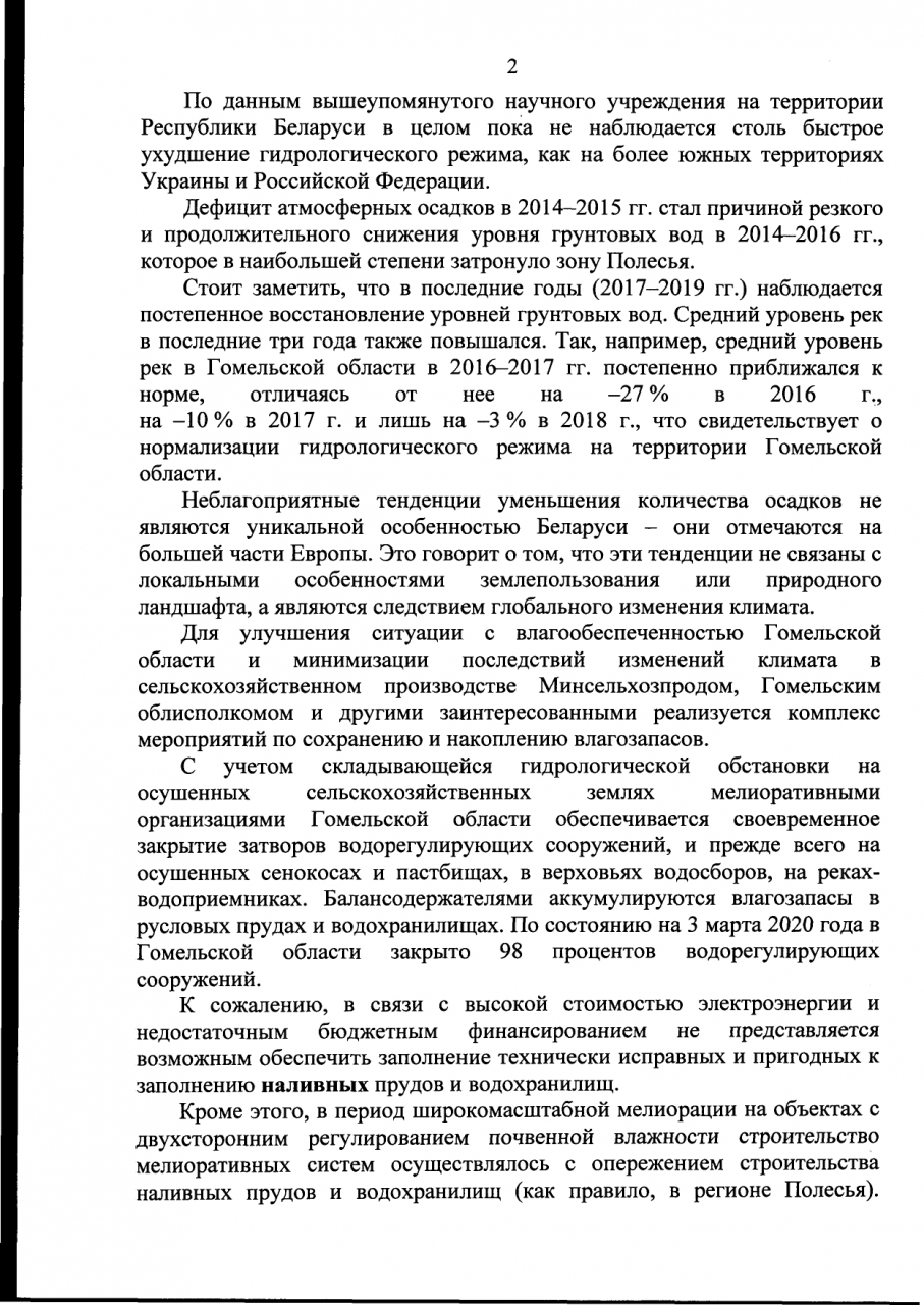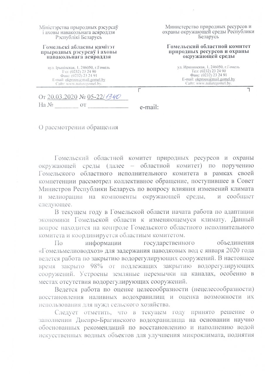 В текущем году в Гомельской области начата работа по адаптации экономики области к изменяющемуся климату. Ведётся работа по оценке целесообразности (нецелесообразности) восстановления наливных водохранилищ и оценка возможности их использования для нужд сельского хозяйства.