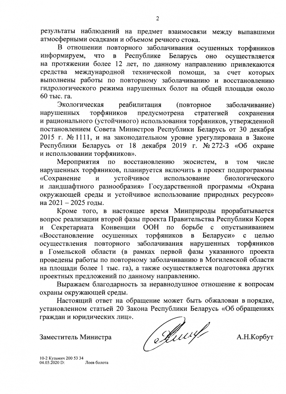 Минприроды прорабатывается вопрос реализации второй фазы проекта Правительства Республики Корея в Секретариата Конвенции ООН по борьбе с опустыниванием "Восстановление осушенных торфяников в Беларуси" с целью осуществления повторного заболачивания нарушенных торфяников в Гомельской области, а также осуществляется подготовка других проектных предложений по данному направлению.