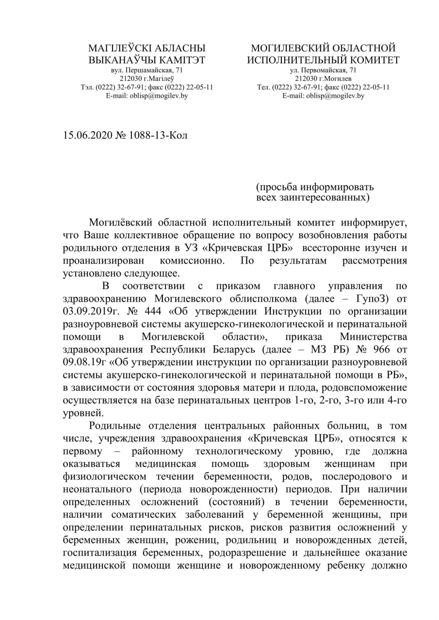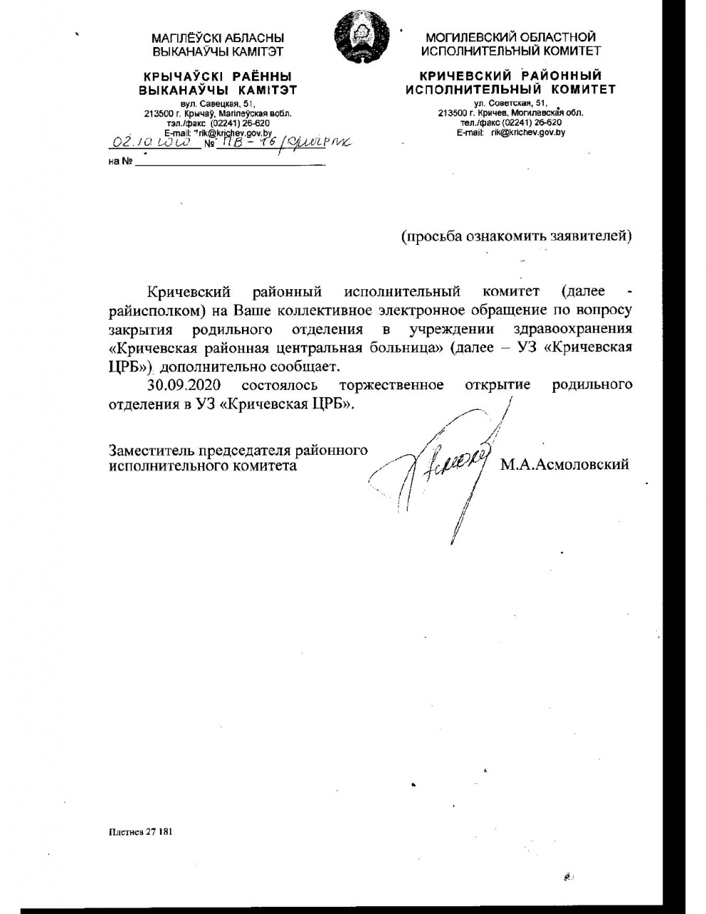 К Вам обращаются жители г.Кричева и Кричевского района, а также иные неравнодушные граждане. Мы обеспокоены ситуацией, складывающейся в районе в связи с закрытием родильного отделения.