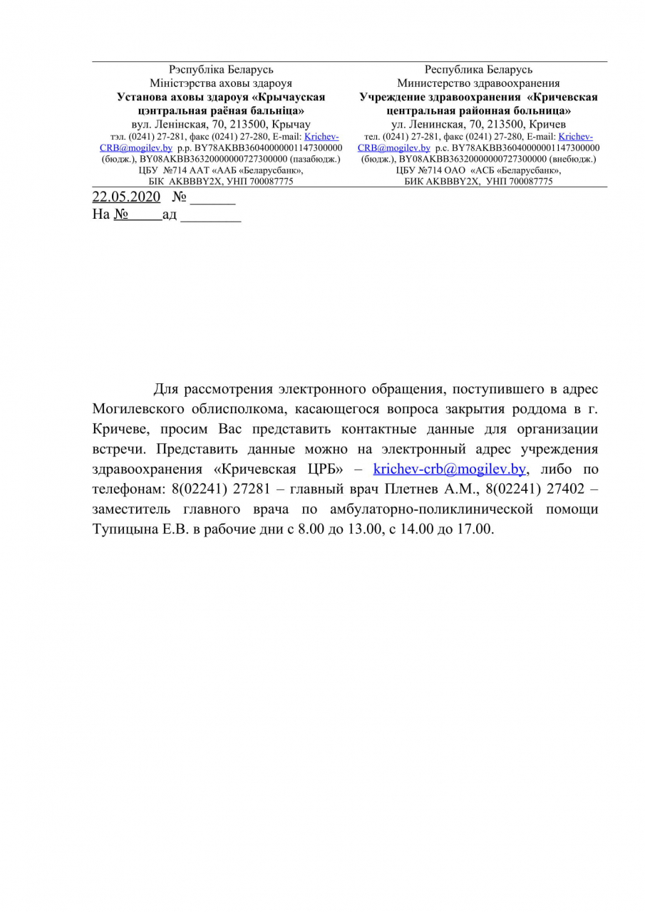 УЗ «Кричевская центральная районная больница» просит заявителей представить контактные данные для организации встречи. Представить данные можно на электронный адрес УЗ «Кричевская ЦРБ» – [email protected], либо по телефонам: 8(02241) 27281, 8(02241) 27402 (в рабочие дни с 8.00 до 13.00, с 14.00 до 17.00).
