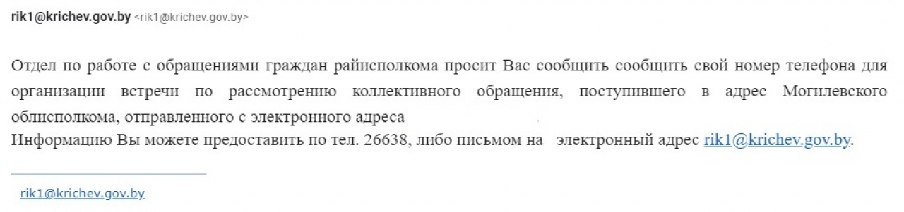 Отдел по работе с обращениями граждан райисполкома просит заявителей сообщить номер телефона для организации встречи по рассмотрению коллективного обращения, поступившего в адрес Могилёвского облисполкома. Информацию можно предоставить по тел.26638, либо письмом на электронный адрес [email protected].