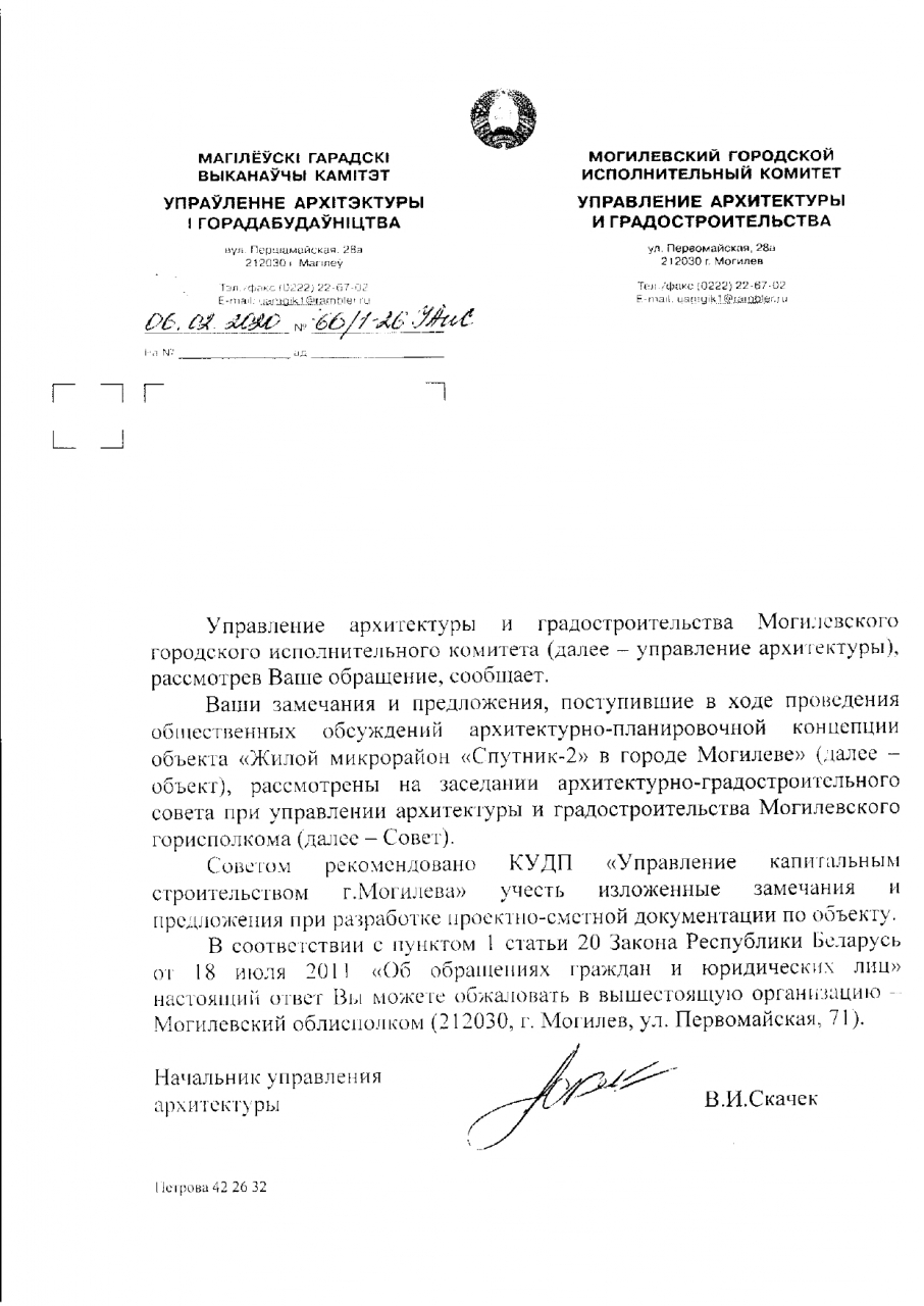По поводу архитектурно-планировочной концепции объекта «Жилой микрорайон "Спутник-2" в городе Могилеве», выставленной на общественное обсуждение (http://mogilev.gov.by/ru/obshchestvennye-obsuzhdeniya/36637-izveshchenie-o-provedenii-obshchestvennogo-obsuzhdeniya-arkhitekturno-planirovochnoj-kontseptsii-ob-ekta-zhiloj-mikrorajon-sputnik-2-v-gorode-mogileve.html), хотим отметить, что: