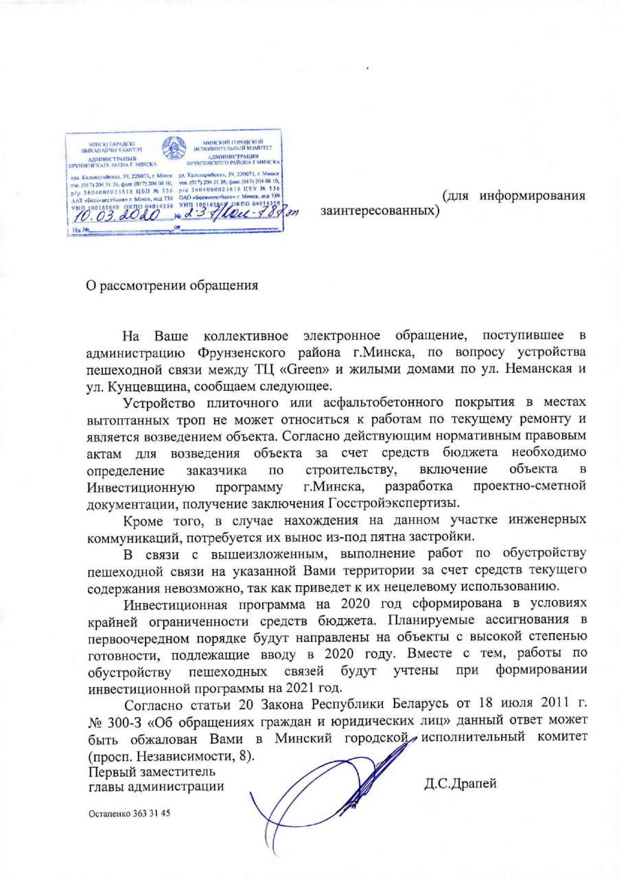 Некоторые из заявителей уже обращались в службу 115.бел и им был дан ответ от УП "Зеленстрой Фрунзенского района" (запрос №234779, к сожалению, ФИО и должность нам не известны): "Согласно ПСД устройство пешеходной связи на указанной территории не возможно. Предлагаем пользоваться существующими пешеходными связями."