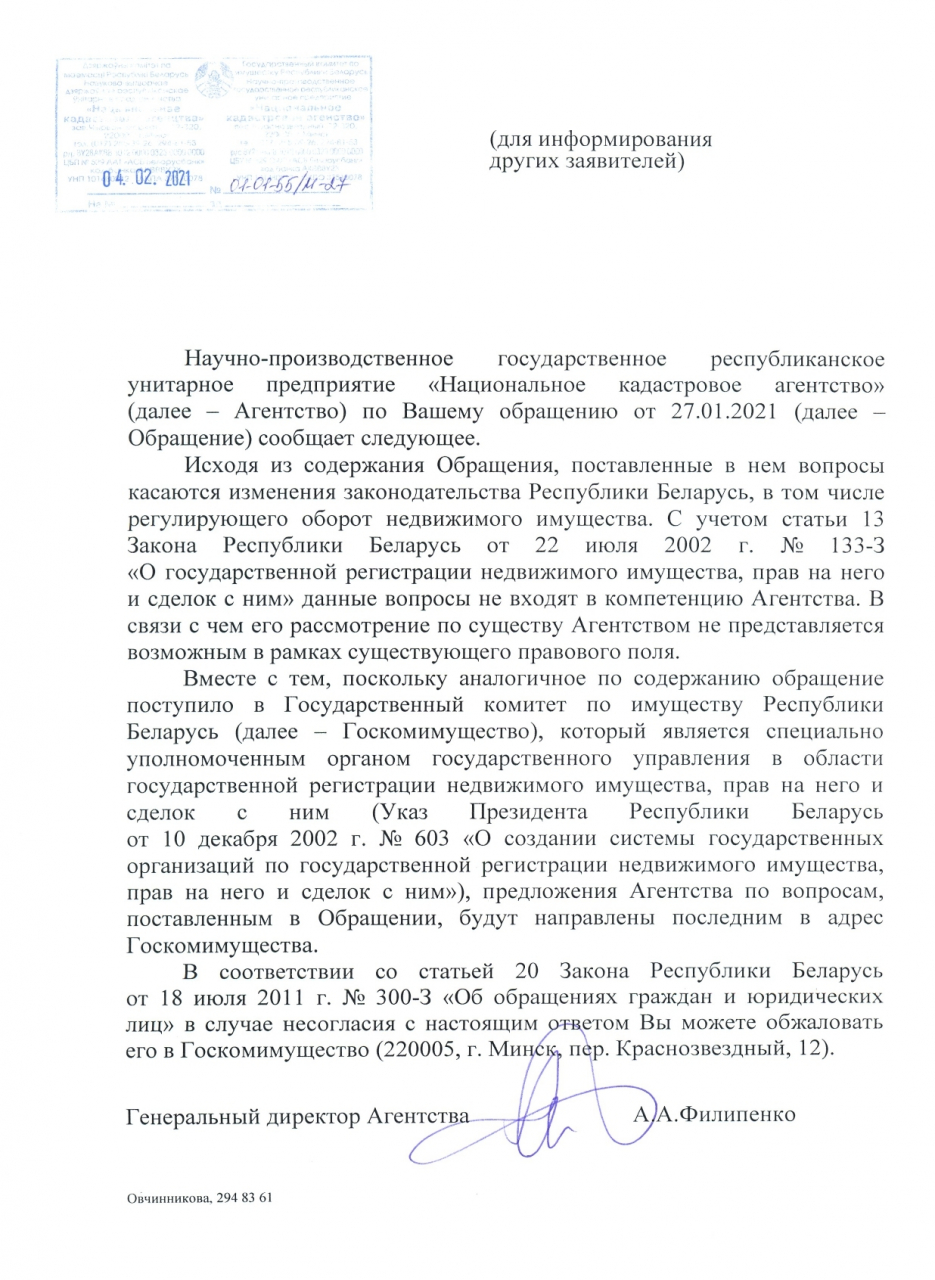 Предложения РУП "Национальное кадастровое агентство" по вопросам, поставленным в обращении, будут направлены агентством в адрес Госкомимущества.