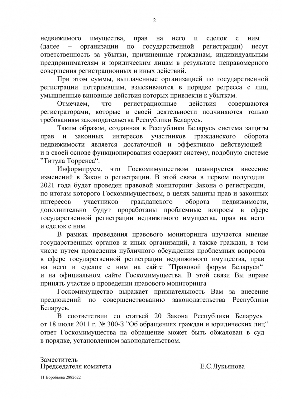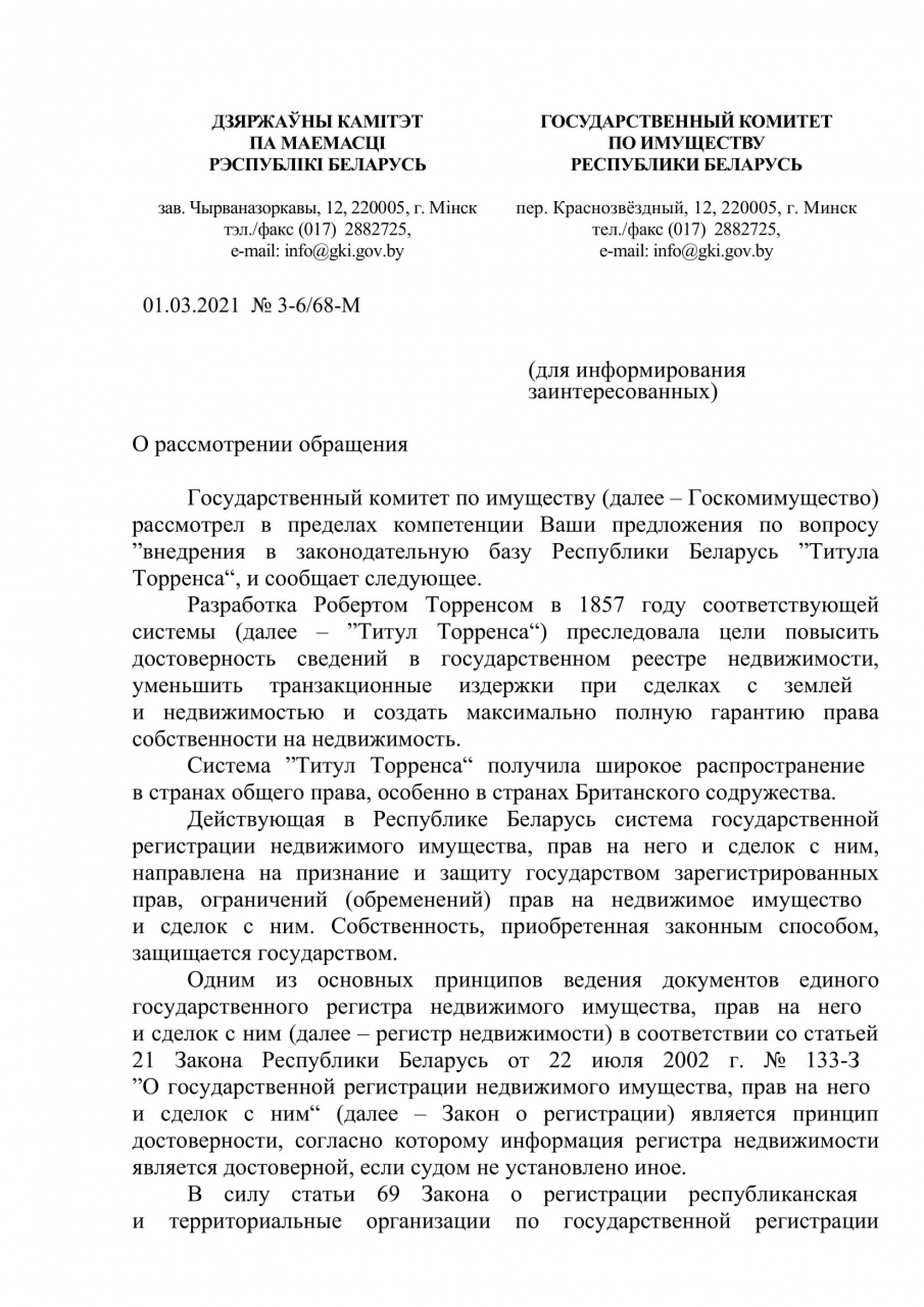 Мы требуем в течение 2020 года подготовить и внедрить всю законодательную базу для соблюдения "титула Торренса", либо схожего по своей сути закона, который бы гарантировал добросовестным покупателям неприкосновенность приобретённой собственности, а в случае ошибки, либо мошенничества, либо единоразово с индексацией затрат компенсировал понесённый ущерб и отчуждал собственность, либо призывал к полной ответственности риелторское агенство, регистратора, нотариуса.