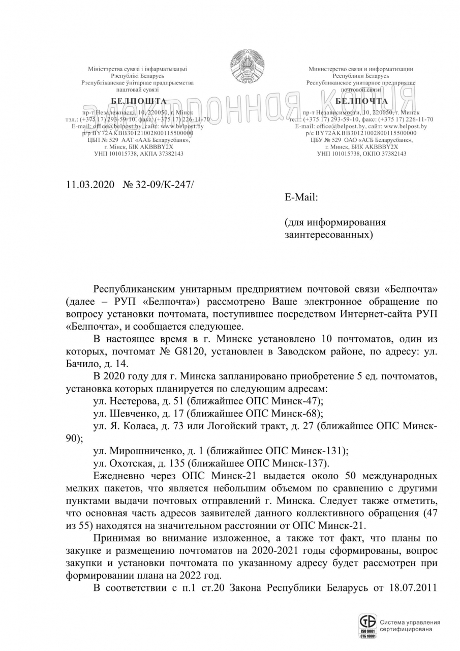 Мы, жители домов, расположенных возле станции метро "Автозаводская", и иные граждане, просим установить почтомат около отделения почтовой связи 21 г. Минска, по адресу пр-т Партизанский, 107, или на ближайшей территории.