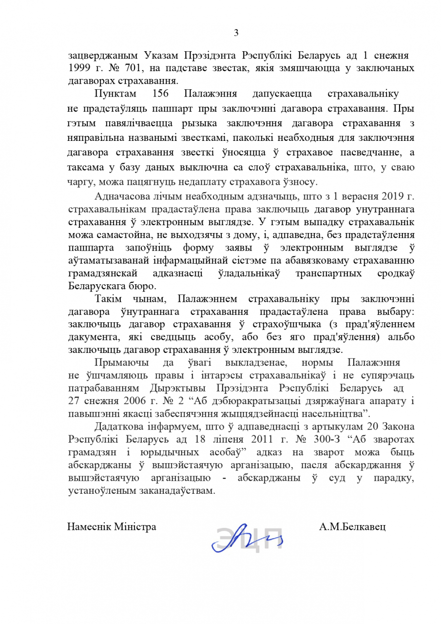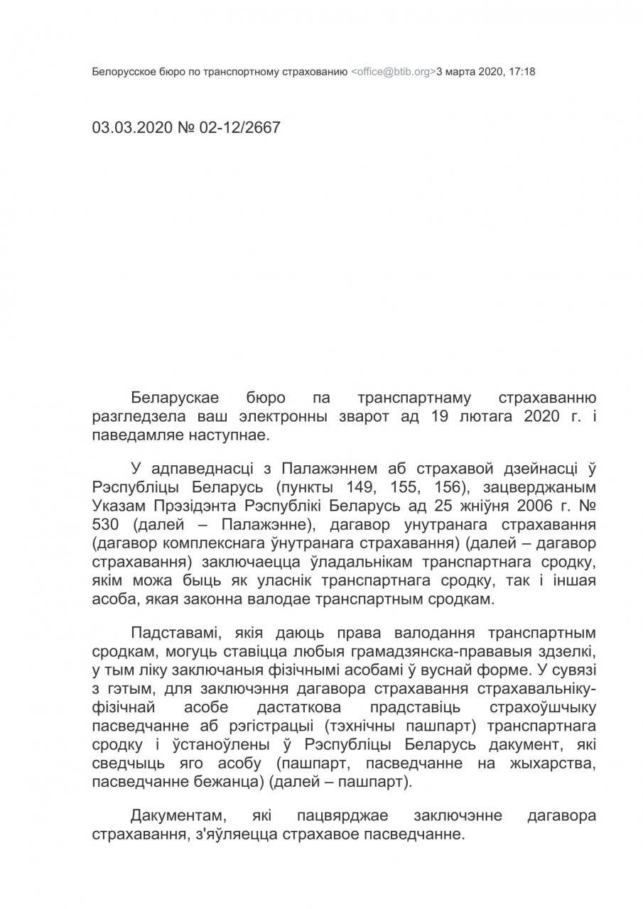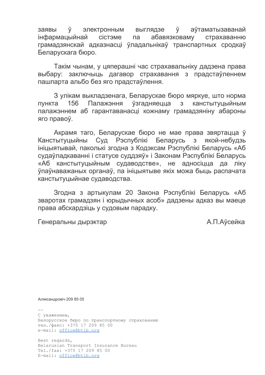 Таму мы патрабуем ад Беларускага бюро па транспартнаму страхаванню сумесна з Палатай прадстаўнікоў Нацыянальнага сходу Рэспублікі Беларусь звярнуцца ў Канстытуцыйны суд з мэтай змянення Указа Прэзідэнта Рэспублікі Беларусь ад 25 жніўня 2006 г. № 530 Аб страхавой дзейнасці і прызнання падпунктаў п.156 "Физическое лицо также представляет страховщику документ, удостоверяющий личность.
