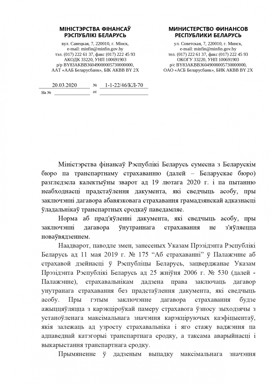 У Рэспубліке Беларусь былі ўнесены змяненні ў працэдуру абавязковага страхавання грамадзянскай адказнасці ўладальнікам транспартных сродкаў. Цяпер пры ажыццяўленні страхавання фiзiчнай асобай неабходна прадаставіць дакумент, падцьвярджаючы яго асобу, а калі такі дакумент непрадастаўляецца, то прымяняецца павышаючы каэфіцыент страхавання.