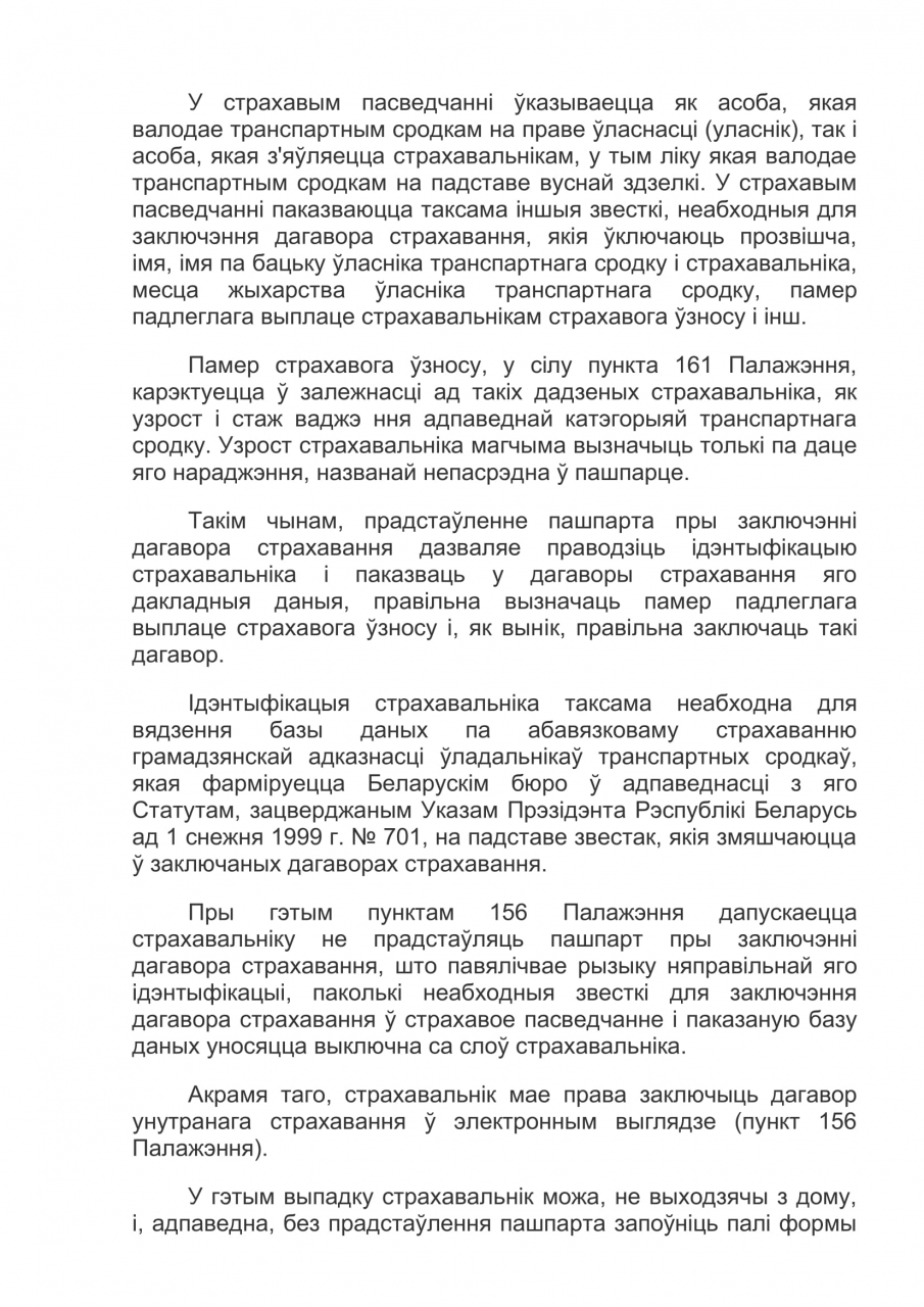 У цяперашні час страхавальніку дадзена права выбару: заключыць дагавор страхавання з прадстаўленнем пашпарта альбо без яго прадстаўлення. Норма пункта 156 Палажэння аб страхавой дзейнасці ў Рэспубліцы Беларусь ўзгадняецца з канстытуцыйным палажэннем аб гарантаванасці кожнаму грамадзяніну абароны яго правоў.