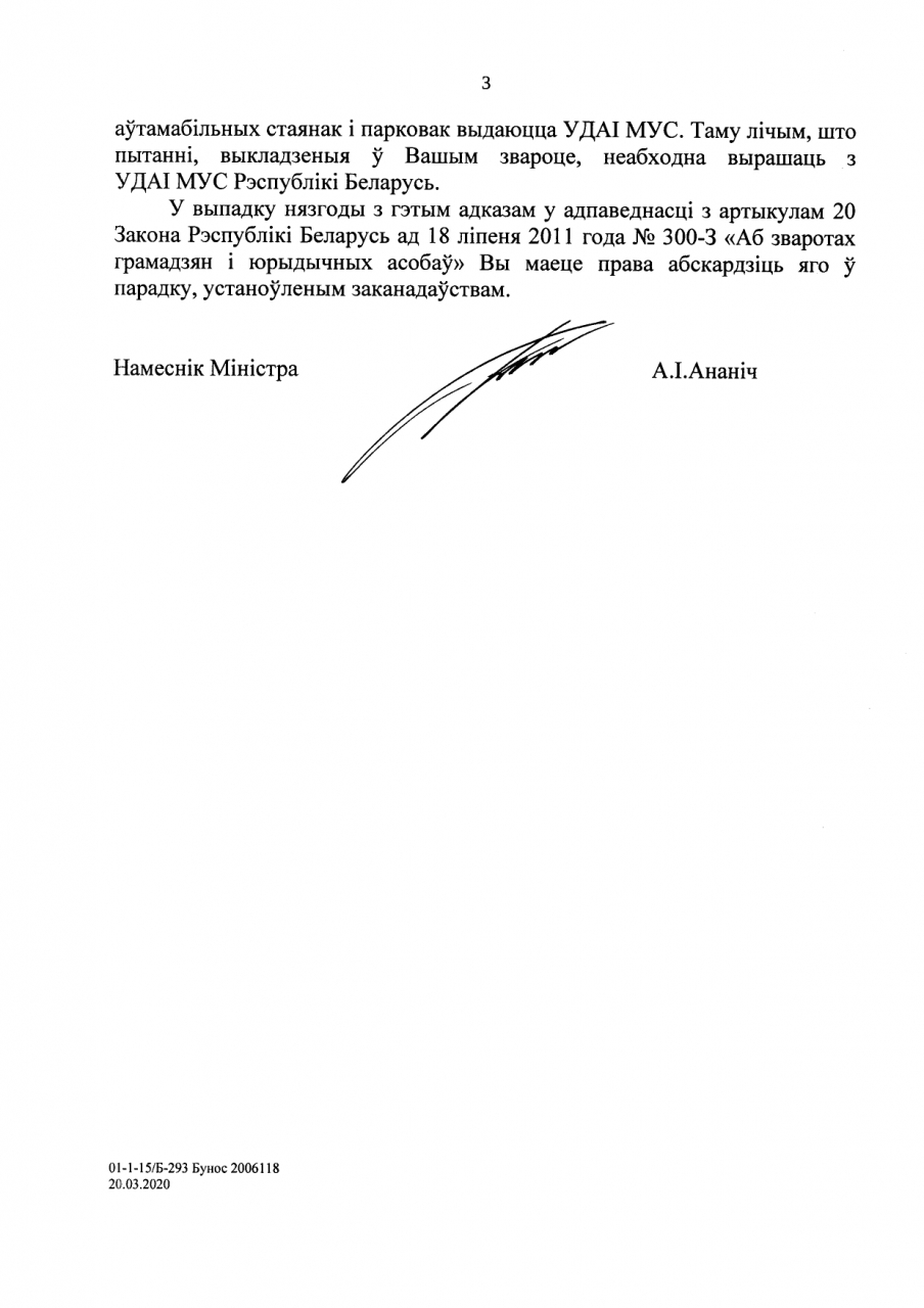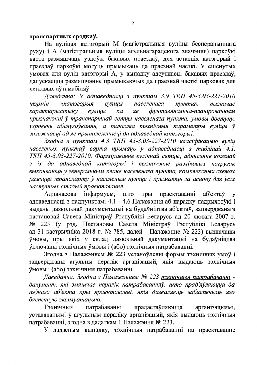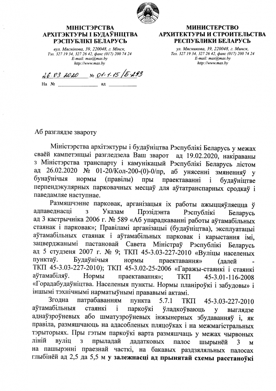 Праблема стаянкі транспартных сродкаў на дадзены момант стаіць востра як у буйных гарадах, так і ў маленькіх. Аўтааматары часта сутыкаюцца як з праблемай паркоўкі аўто, так і з праблемай прыпаркованых аўто ў крайняй правай паласе паралельна бардзюра, што часта ўскладняе праезд па дарозе як з чатырьмя, так і з шасцю палосамі руху. У сувязі з гэтым, мы патрабуем ад Беларускага дарожнага навукова-даследчага інстытуту «БелдорНДІ» і Міністэрства транспарта і камунікацый аб'яднацца з мэтай распрацоўкі правіл і методык па будаўніцтве і мадэрнізацыі дарог гарадоў з будаўніцтвам перпендыкулярных паркоаачных месцаў пасля крайняй правай паласы руху, а пры немагчымасці будаўніцтва перпендыкулярных парковачных месцаў, арганізоўваць будаўніцтва паралельных парковачных месцаў.