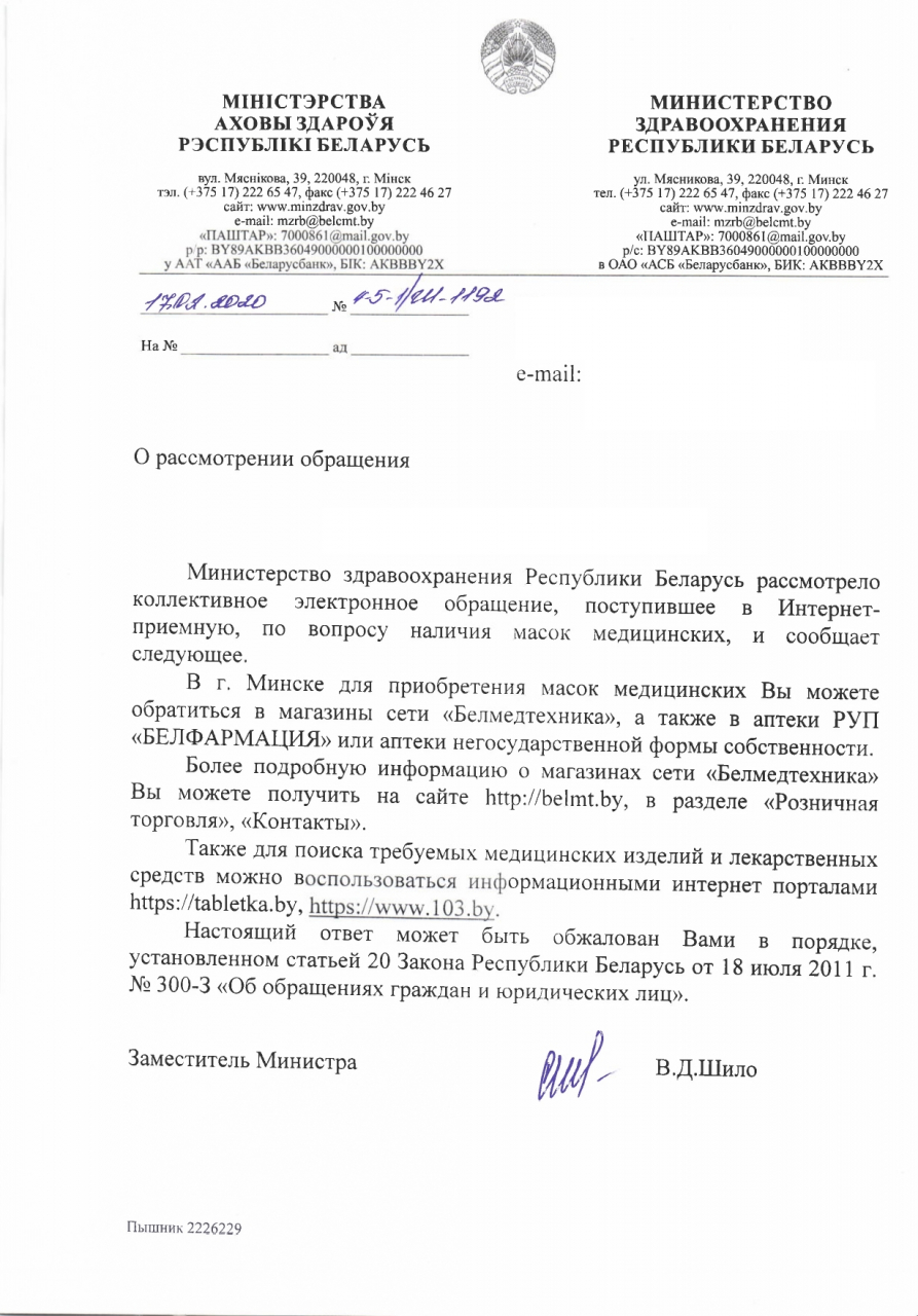 Руководствуясь п.8.13 Положения о Министерстве здравоохранения, который устанавливает, что Минздрав в соответствии с возложенными на него задачами организует и контролирует обеспечение населения и организаций здравоохранения лекарственными средствами, изделиями медицинского назначения и медицинской техникой, запасными частями к ним, мы требуем обеспечить аптеки Беларуси достаточным количеством медицинских масок! Позаботьтесь о своих гражданах, а не только о дружественном Китае!
