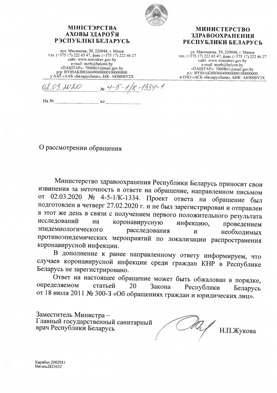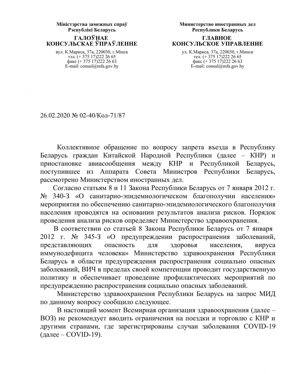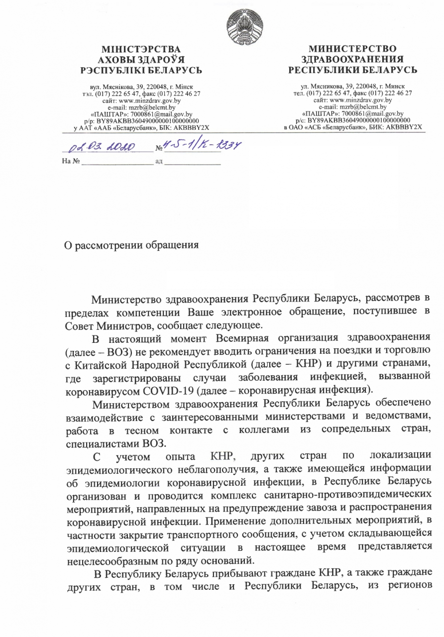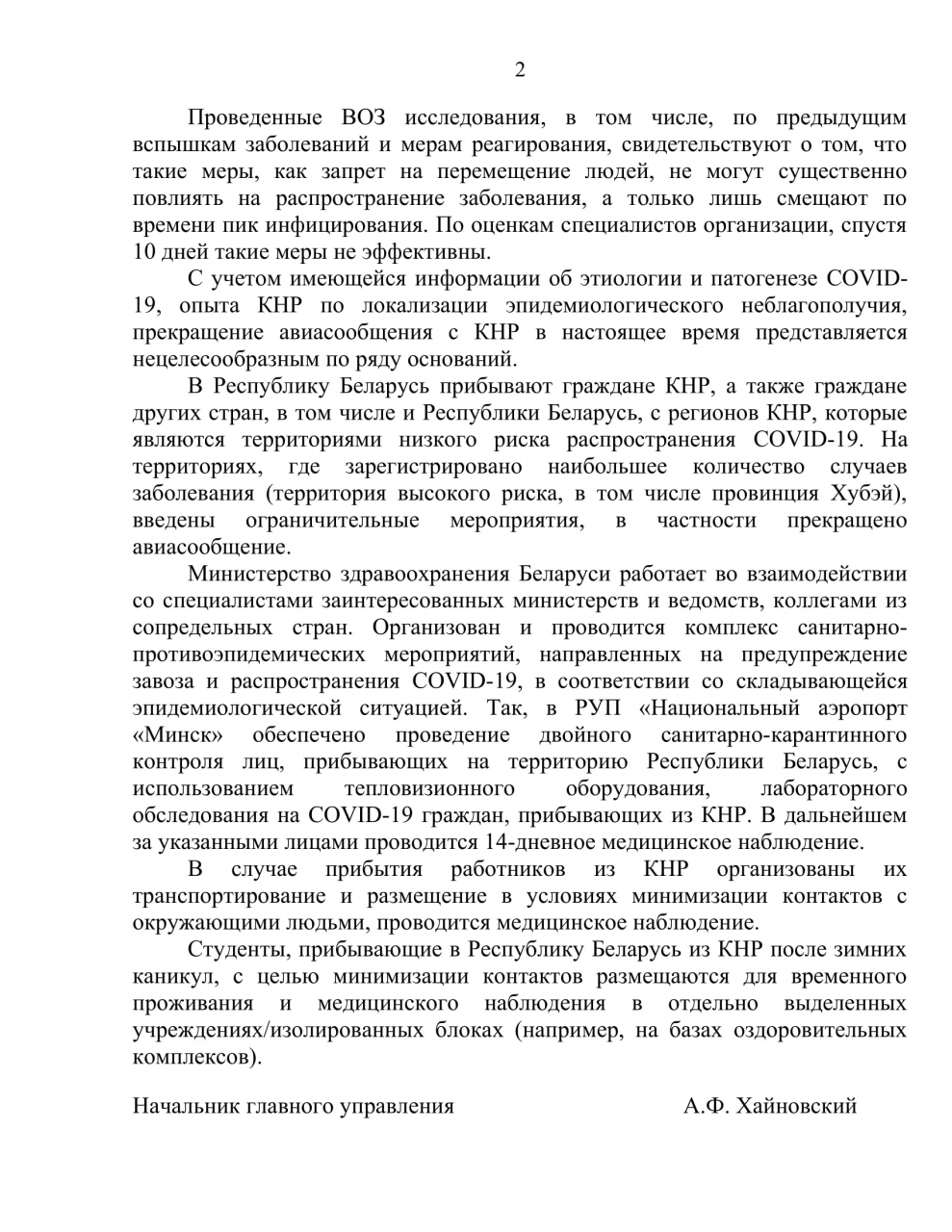 Закрытие транспортного сообщения, с учётом складывающейся эпидемиологической ситуации в настоящее время представляется нецелесообразным по ряду оснований. Случаев коронавирусной инфекции среди граждан КНР в Республике Беларусь не зарегистрировано.