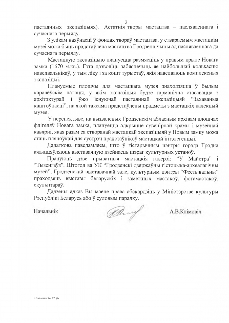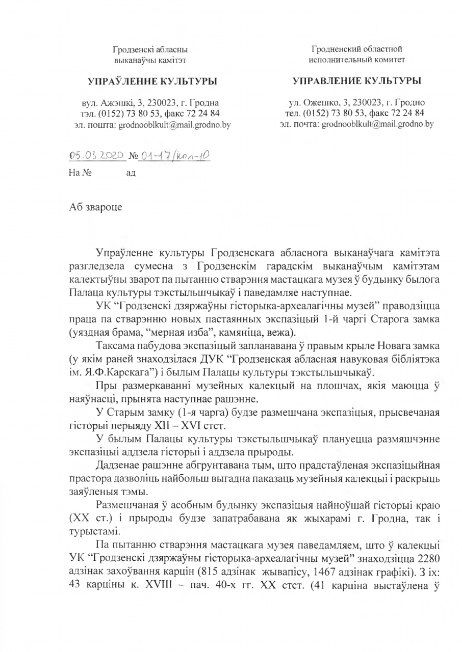 У горадзе Гродна маецца значная калекцыя твораў мастацтва, у тым ліку карціны прызнаных мастакоў мінулага, а таксама творы сучасных майстроў Гродна і Гродзеншчыны. У сувязі з гэтым, на наш погляд, дарэчна стварэнне ў горадзе спецыяльнай мастацкай галерэі, для экспанавання гэтых маючых культурную каштоўнасць прадметаў. Зараз адбываецца рэканструкцыя былога палаца культуры тэкстыльшчыкаў - вялікага прадстаўнічага будынка на галоўнай плошчы горада. Гэты аб'ект мог бы быць выкарыстаны ў якасці месца размяшчэння гарадзенскай мастацкай галерэі. Падобныя прапановы ўжо паступалі ў адміністрацыю горада. Аднак было прынята папярэдняе рашэнне б арганізацыі ў будынку былога палаца тэкстыльшчыкаў музея прыроды, дзе мяркуецца экспанаваць чучалы жывёл, узоры сельгас прадукцыі і таму падобныя аб'екты. На наш погляд галоўная плошча горада не месца для размяшчэння падобных экспанатаў. Значна большую цікавасць у гродзенцаў і гасцей горада магла б выклікаць менавіта мастацкая галерэя.