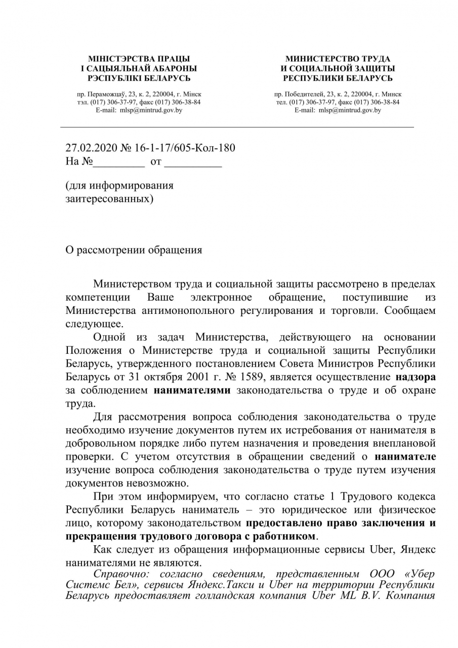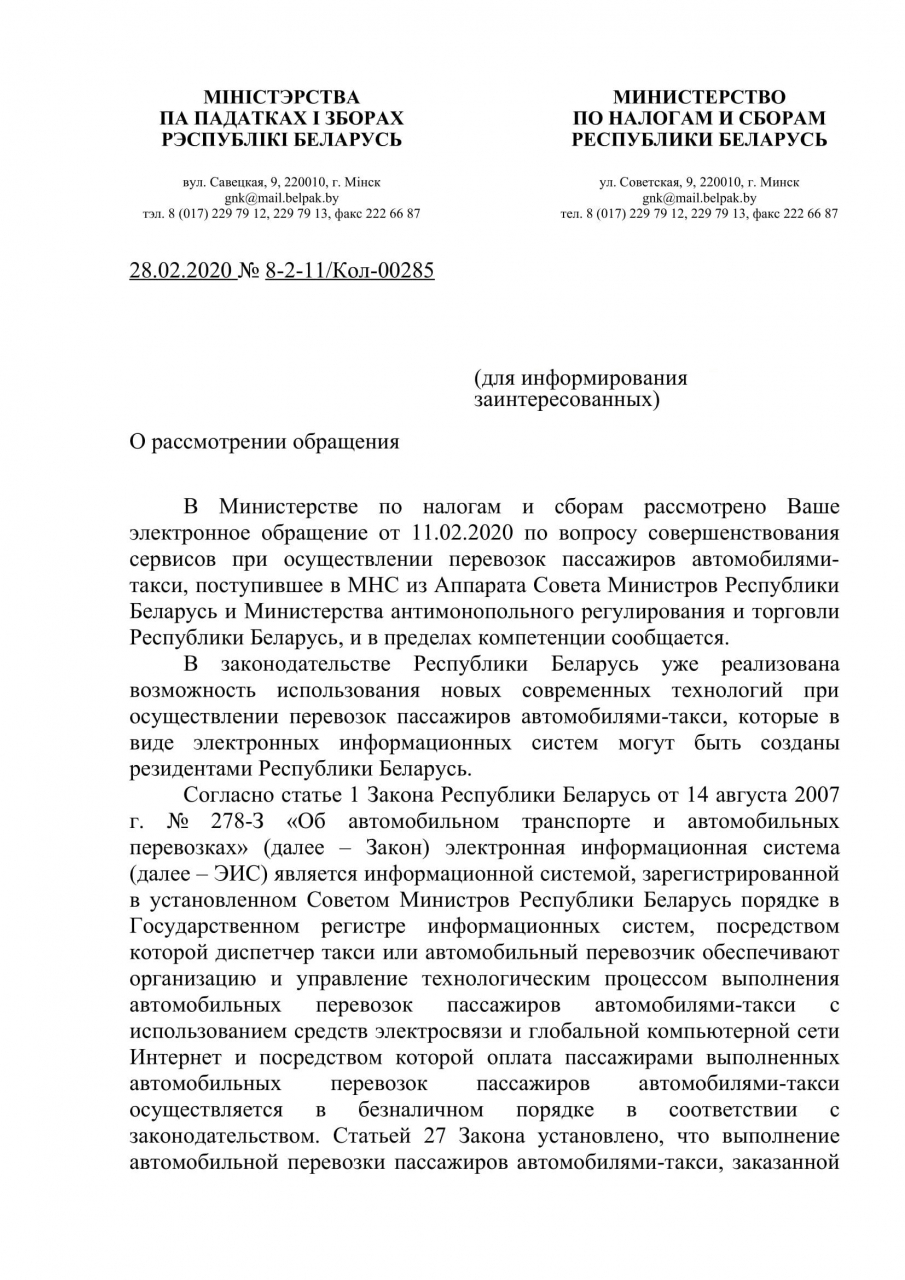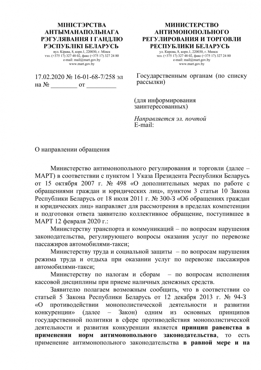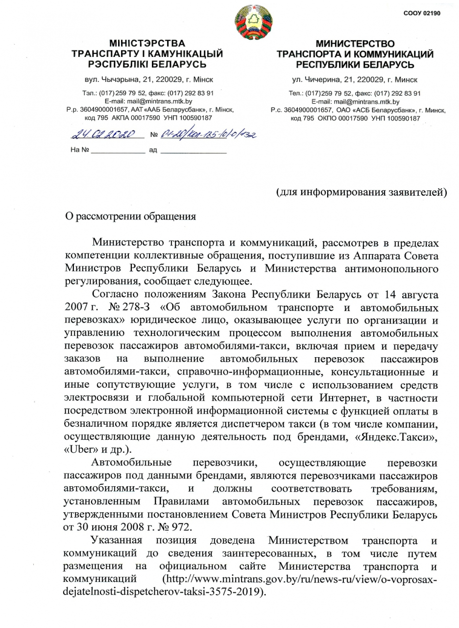 Мы, нижеподписавшиеся, водители автомобилей-такси, индивидуальные предприниматели, руководители организаций и просто неравнодушные граждане, обращаемся к Вам с просьбой рассмотреть вопрос об изменении порядка работы на территории Республики Беларусь информационных сервисов Uber, Яндекс Такси и иных подобных сервисов (далее - ИС).