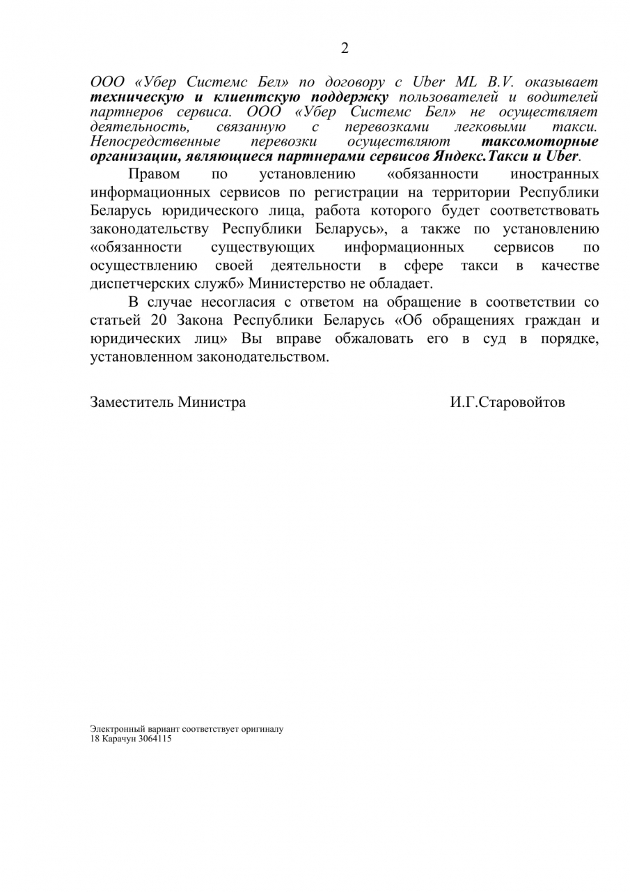 У нас имеются достаточные основания полагать, что существует несоответствие законодательства Республики Беларусь и постоянно развивающихся ИС, которые предоставляют современные, удобные и пользующиеся большим спросом услуги как для работодателей, так и для конечных клиентов. Это несоответствие приводит к тому, что быстрое развитие и распространение ИС происходит, полагаем, с нарушением многих законодательных и нормативно-правовых актов Республике Беларусь. Мы видим, что наши государственные органы и министерства не успевают должным образом реагировать на происходящие изменения, им необходимо много времени для анализа ситуации и принятия решения. А тем временем накапливаются трудности и проблемы в отрасли такси. И ответственность за эти проблемы и их последствия обычно ложатся на плечи тех, кто непосредственно оказывает данные услуги. В тоже время никаких претензий о нарушении законодательства Республики Беларусь мы самим ИС предъявить не можем.