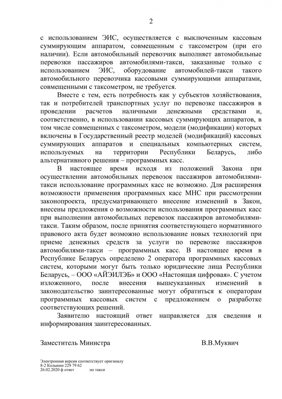 Для расширения возможности применения программных касс МНС при рассмотрении законопроекта, предусматривающего внесение изменений в Закон «Об автомобильном транспорте и автомобильных перевозках», внесены предложения о возможности использования программных касс при выполнении автомобильных перевозок пассажиров автомобилями-такси. После принятия соответствующего нормативного правового акта будет возможно использование новых технологий при приёме денежных средств за услуги по перевозке пассажиров автомобилями-такси – программных касс.