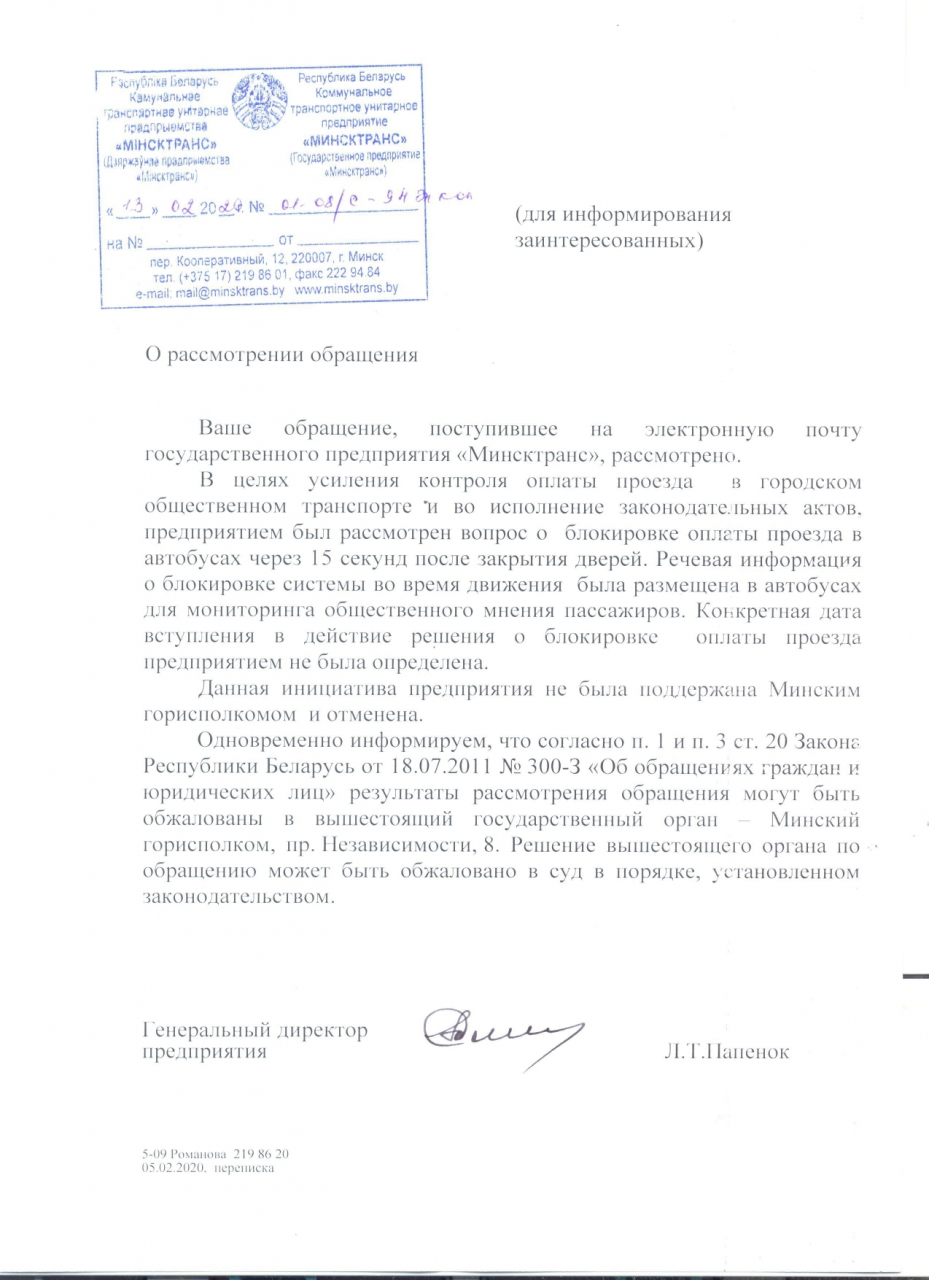 Речевая информация о блокировке системы во время движения транспорта была размещена в автобусах для мониторинга общественного мнения пассажиров. Конкретная дата вступления в действия решения о блокировке оплаты проезда ГП "Минсктранс" не была определена. Данная инициатива предприятия не была поддержана Мингорисполкомом и отменена.