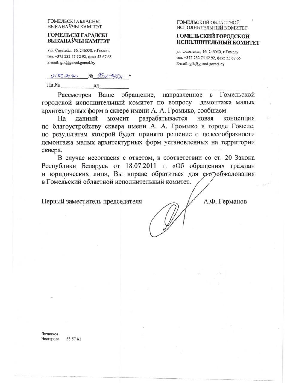 Разрабатывается новая концепция по благоустройству сквера имени А.А.Громыко, по результатам которой будет принято решение о целесообразности демонтажа малых архитектурных форм, установленных на территрии сквера.