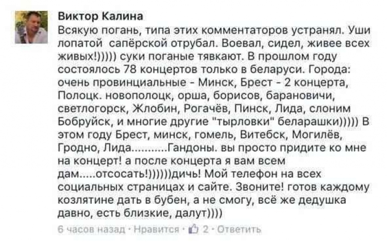 "Калина Виктор Владимирович, имея опыт военных действий в составе иррегулярных бандформирований, действующих на Юго-востоке Украины. В частности, шансонье выступает в российской военной форме с наградами «ДНР» на груди. Следует отметить, что в ходе боевых действий Калина Виктор Владимирович проявлял крайнюю жестокость по отношению к военнопленным солдатам и офицерам ВСУ, отрубая им уши саперной лопатой, о чем с гордостью говорил лично, при этом выражая намерение применять подобную практику в отношении граждан Республики Беларусь с отличной от его гражданской позицией.