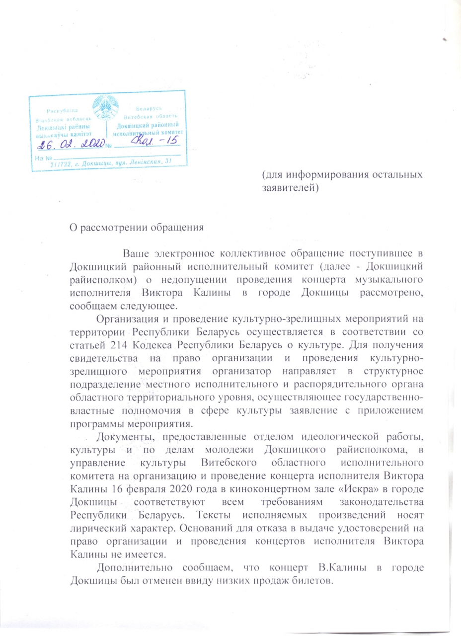 Просим принять меры по недопущению проведения концерта музыкального исполнителя Калины В.В., планируемого 16 февраля 2020 года в 17:00 в Городском Центре культуры в городе Докшицы.