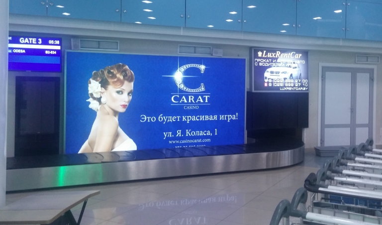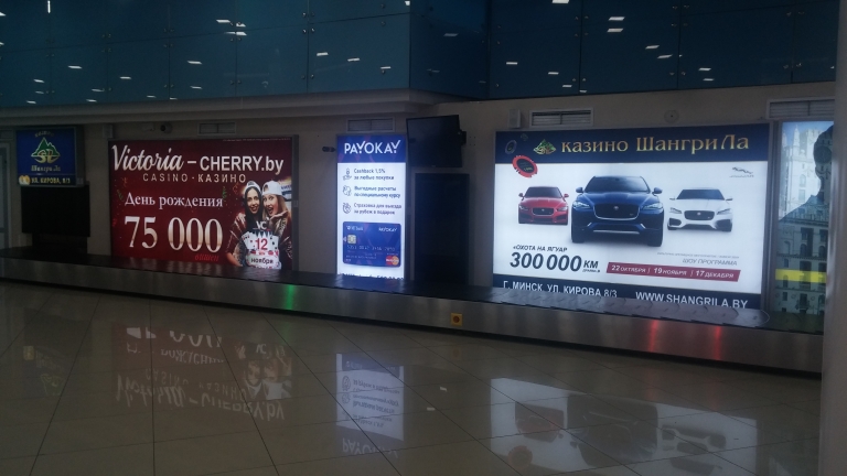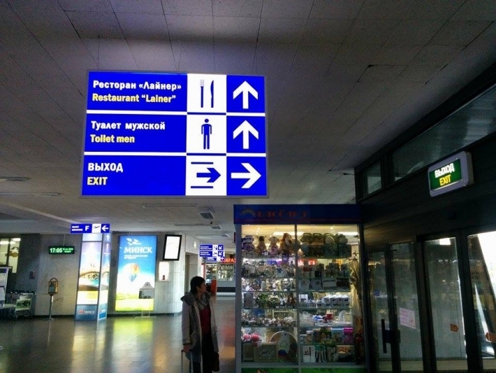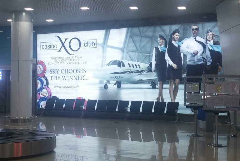 Але ж калі прылятаеш міжнародным рэйсам і заходзіш у нацыянальны аэрапорт, то складваецца ўражанне, што прыехаў у нейкі расійскі Лас-Вегас. На ўваходзе нас сустракае "Welcome" ды «Добро пожаловать», але нават «Сардэчна запрашаем у Беларусь» няма. Ідзем далей і бачым шыльды на рускай, часам англійскай мове і ніводнага слова на роднай мове. Крочым далей забіраць багаж, а там нас сустракае рэклама казіно з блэкджэкам ды дзяўчатамі.