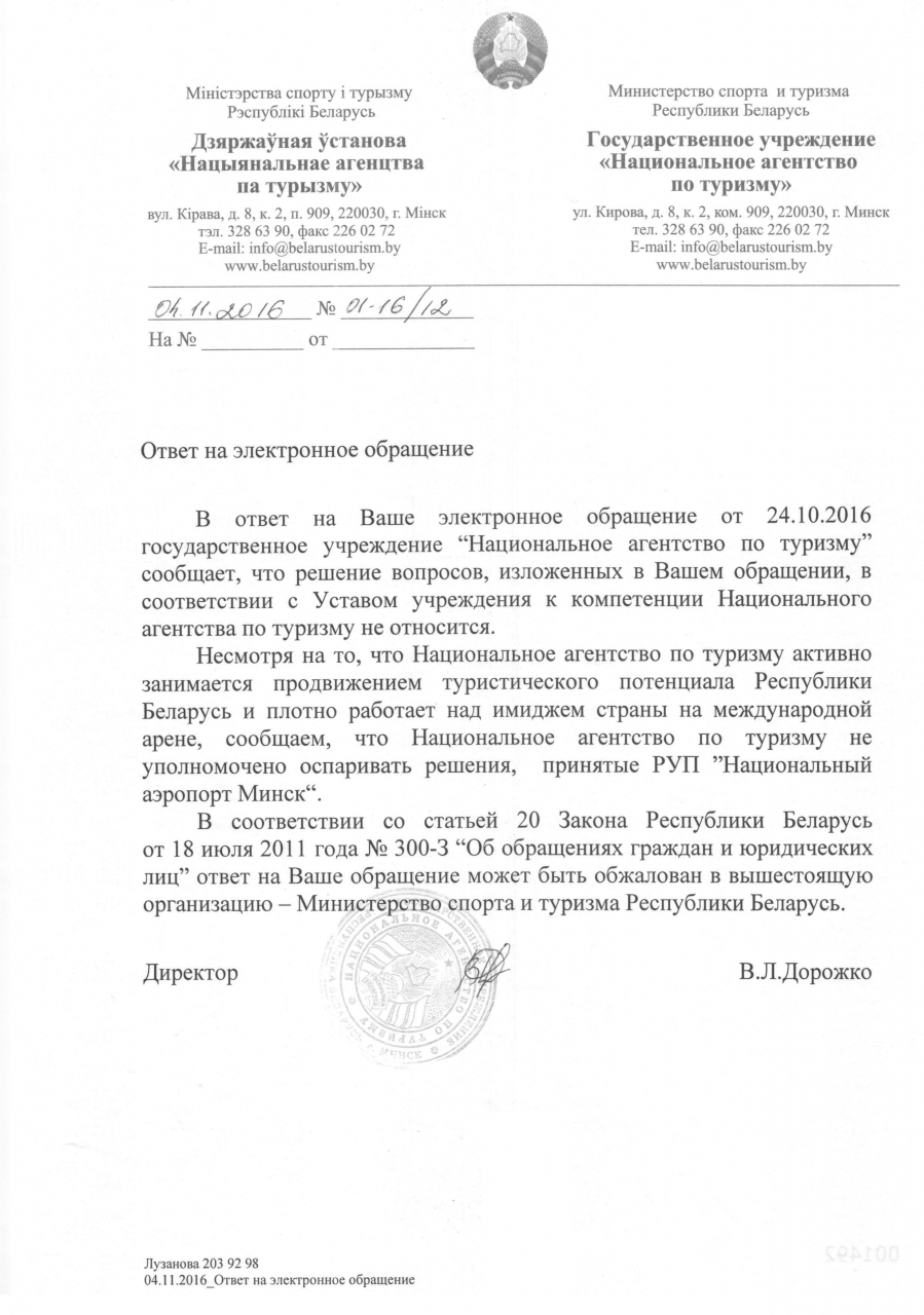 Национальное агентство по туризму активно занимается продвижением туристического потенциала Республики Беларусь и плотно работает над имиджем страны на международной арене, однако оно не вправе оспаривать решения РУП "Национальный аэропорт Минск".