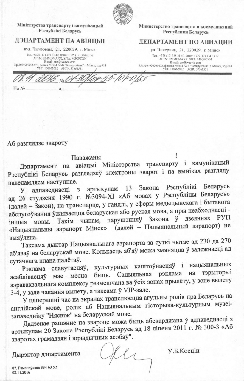 Што тычыцца адказу кіраўніцтва РУП «Нацыянальны аэрапорт Мінск», то, па-першае, мы ведаем дзеючае заканадаўства «Аб мовах…» і нам не трэба яго тлумачыць.
