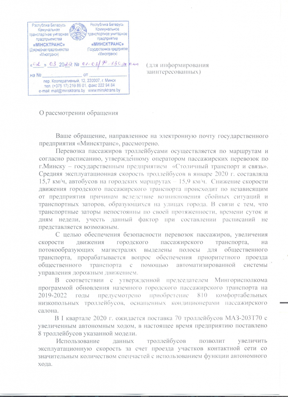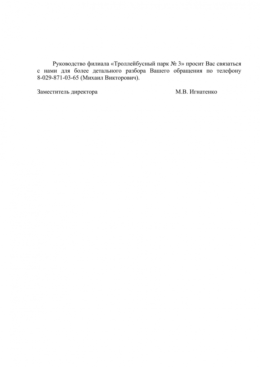 Руководство филиала «Троллейбусный парк № 3» просит заявителей связаться с ним по телефону 8-029-871-03-65 (Михаил Викторович) для более детального разбора обращения.