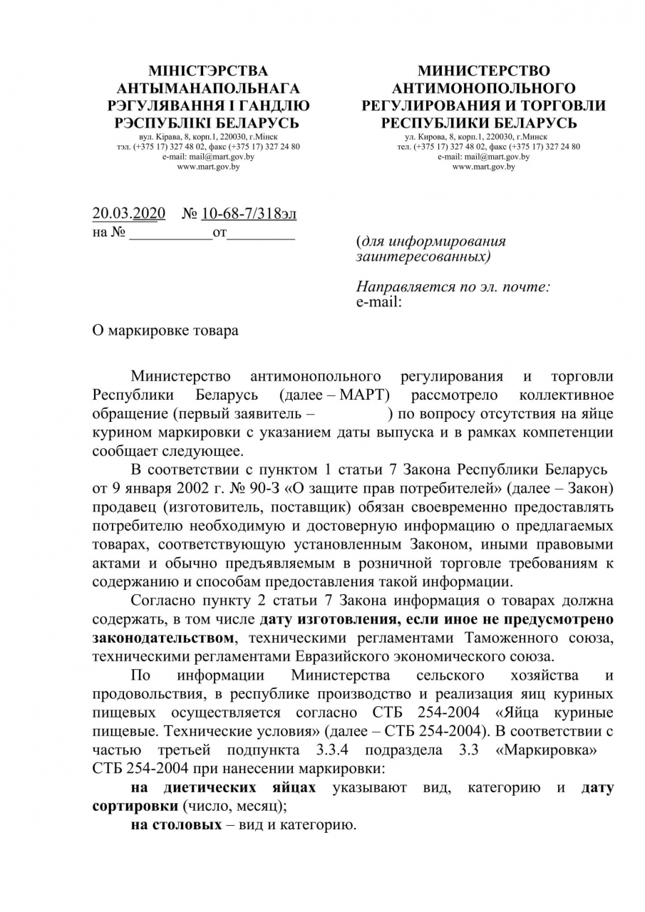 Таким образом, обоснованно считаем, что отсутствие даты непосредственно на яйцах ущемляет права потребителя и одновременно предоставляет приемлемые условия производителям и реализаторам для возможности недобросовестного исполнения своих обязанностей. На основании вышеизложенного, в целях восстановления равенства прав между производителем, реализатором и потребителем просим обязать производителей на законодательном уровне помимо штампа с маркировкой каждого яйца одновременно указывать дату его выпуска.