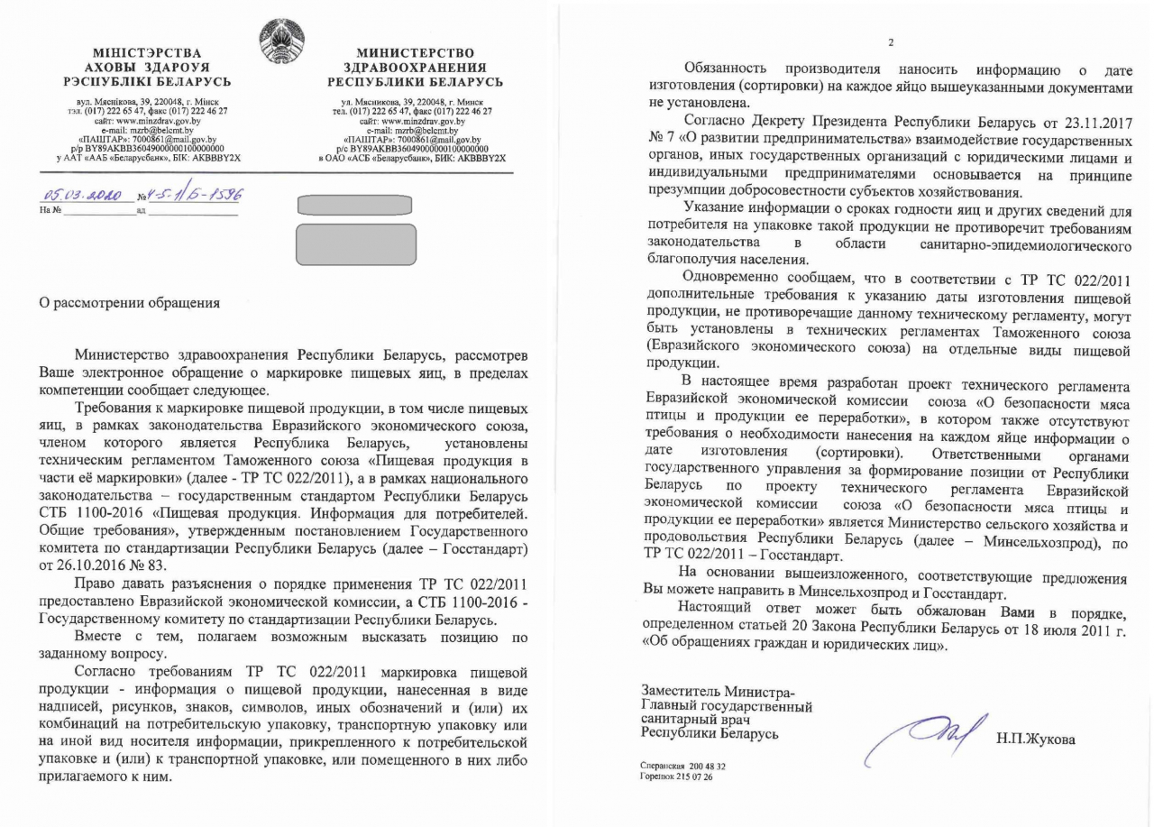 В настоящее время разработан проект ТР Евразийской экономической комиссии союза «О безопасности мяса птицы и продукции ее переработки» в котором отсутствует требование о необходимости нанесения на каждом яйце информации о дате изготовления (сортировки). Однако соответствующее предложение можно отправить в Минсельхозпрод и Госстандарт, т.к. они являются ответственными органами госуправления за формирование позиции от Республики Беларусь.