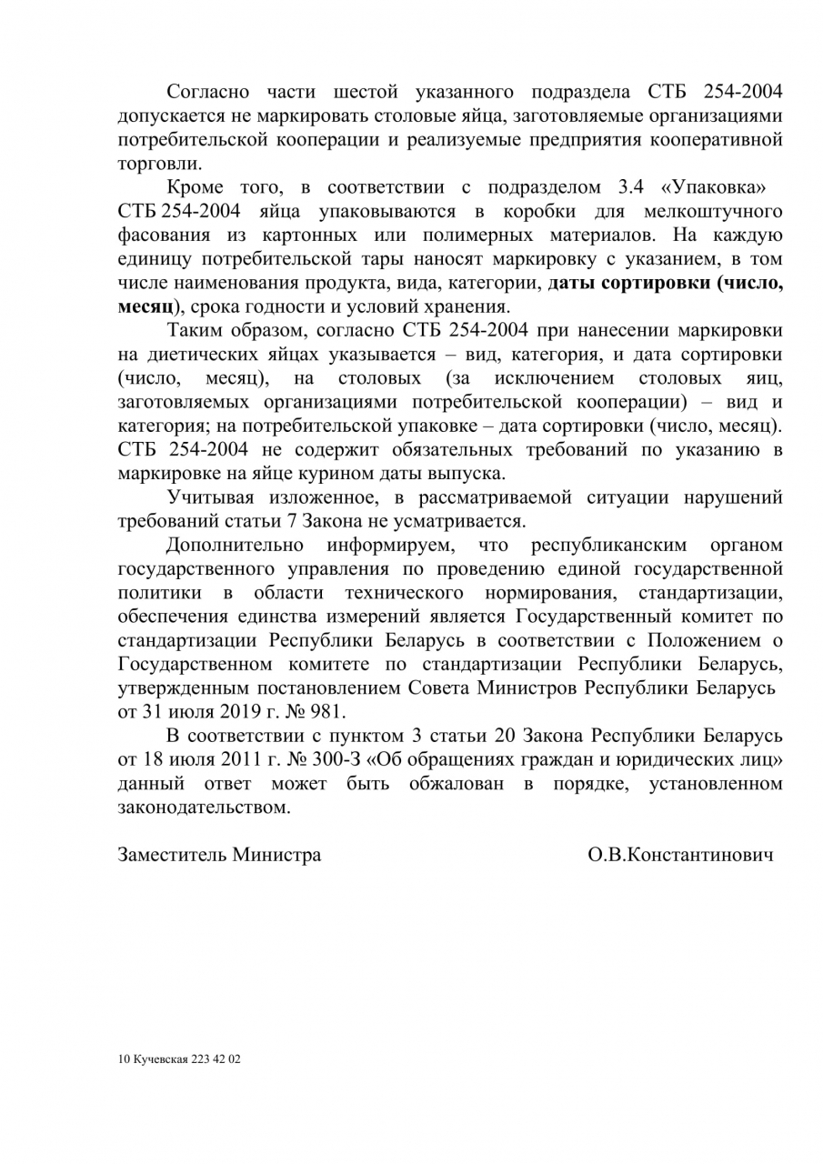 Согласно СТБ 254-2004 при нанесении маркировки на диетических яйцах указывается – вид, категория, и дата сортировки (число, месяц), на столовых (за исключением столовых яиц, заготовляемых организациями потребительской кооперации) – вид и категория; на потребительской упаковке – дата сортировки (число, месяц). СТБ 254-2004 не содержит обязательных требований по указанию в маркировке на яйце курином даты выпуска. Учитывая изложенное, в рассматриваемой ситуации нарушений требований статьи 7 Закона «О защите прав потребителей» не усматривается.