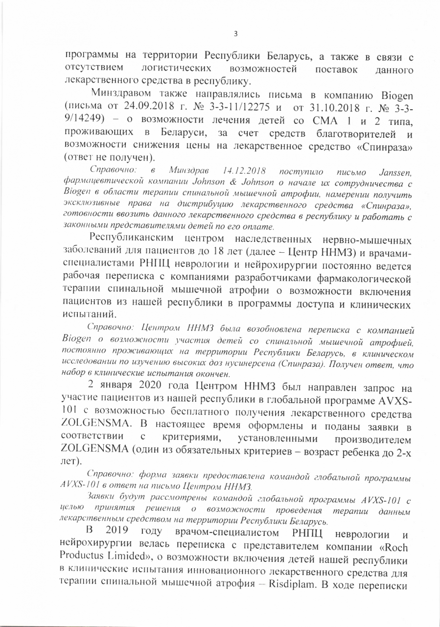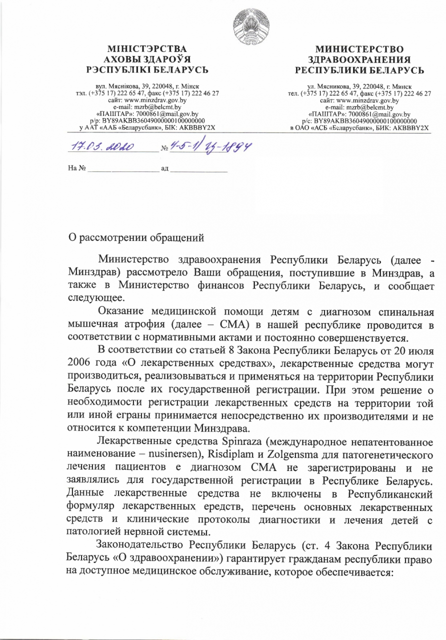 1) обеспечить всем белорусам, больным спинальной мышечной атрофией (СМА), вне зависимости от типа СМА, их возраста и функционального статуса доступ на территории Республики Беларусь к существующим препаратам, останавливающим заболевание, и выделить бюджет на закупку этих препаратов с клинически доказанной эффективностью;