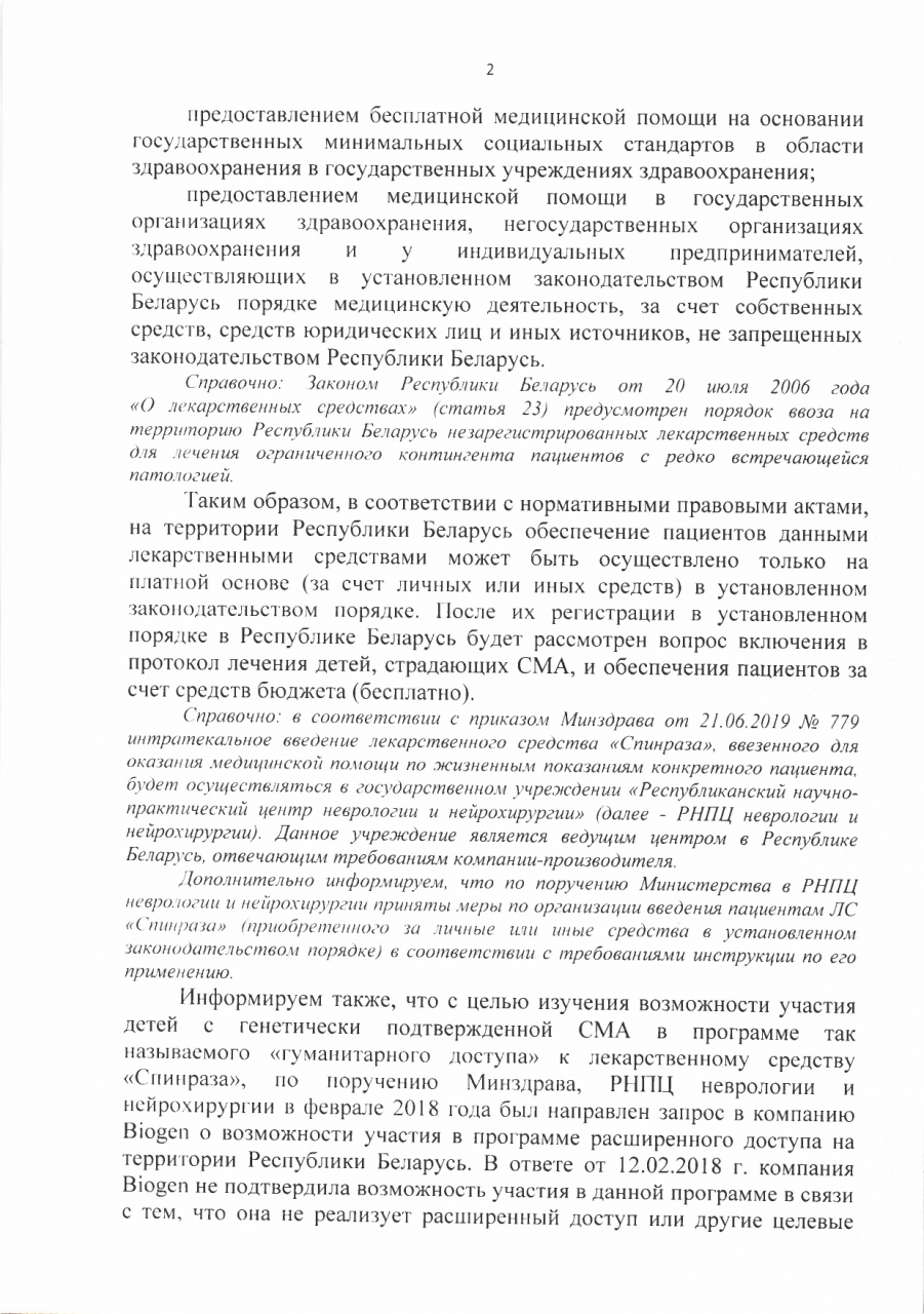 2) оперативно принять меры, направленные на создание правовых условий, позволяющих применять и реализовывать в Республике Беларусь программы фармацевтических организаций расширенного (дорегистрационного) доступа пациентов со СМА к инновационным препаратам в соответствии с законами Республики Беларусь, и привести национальную нормативно-правовую базу в соответствие с возможностью реализации сценария доступа пациентов со СМА к препаратам в рамках программ расширенного регистрационного доступа на территории Республики Беларусь;