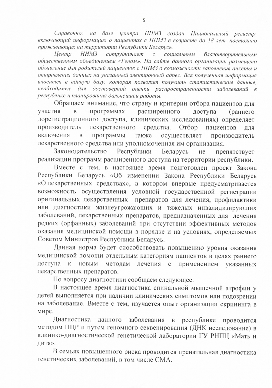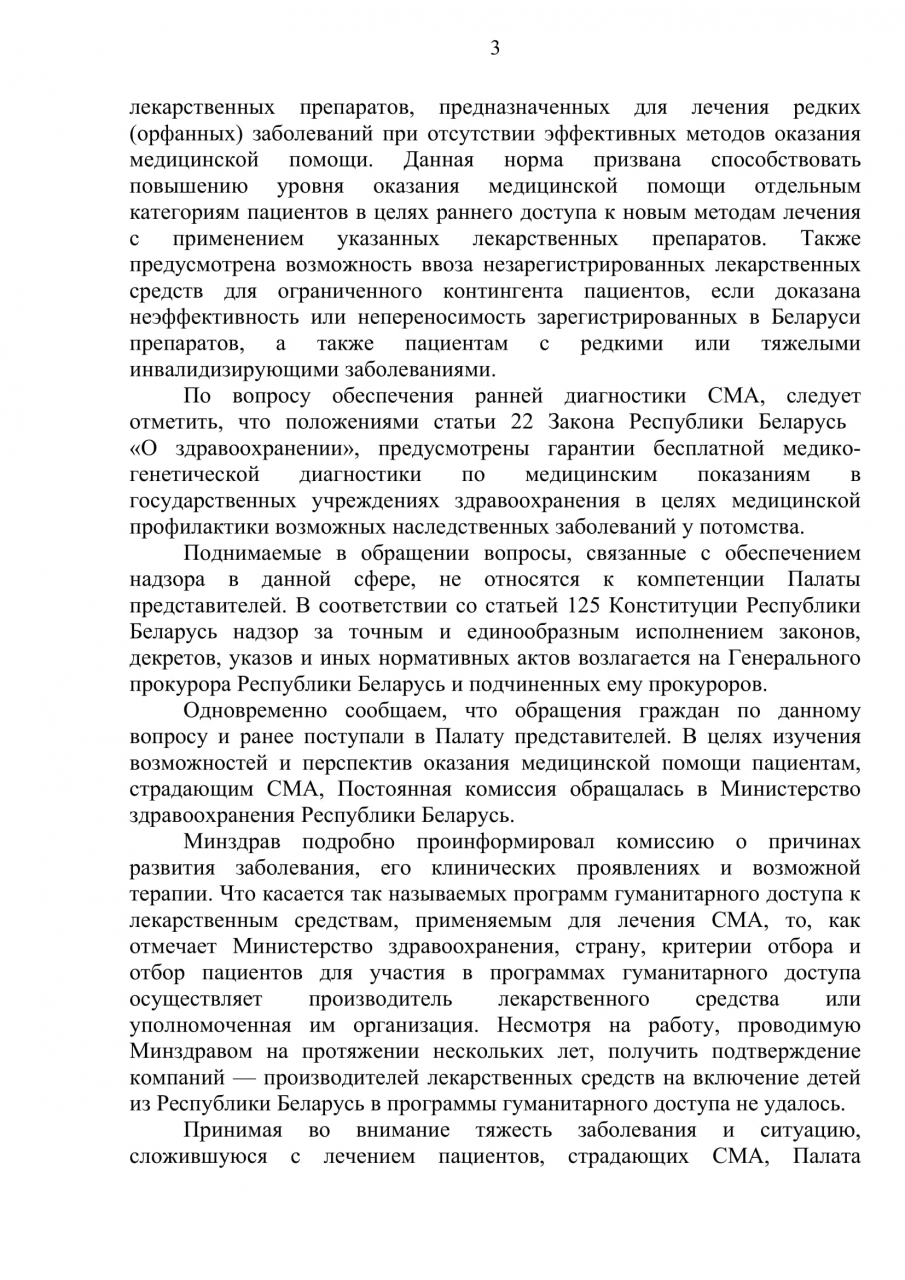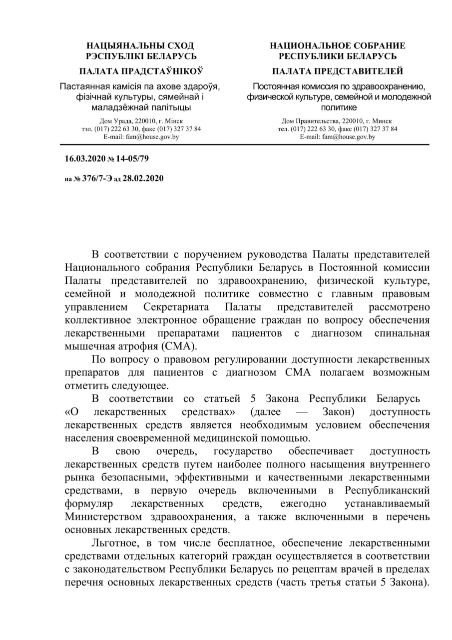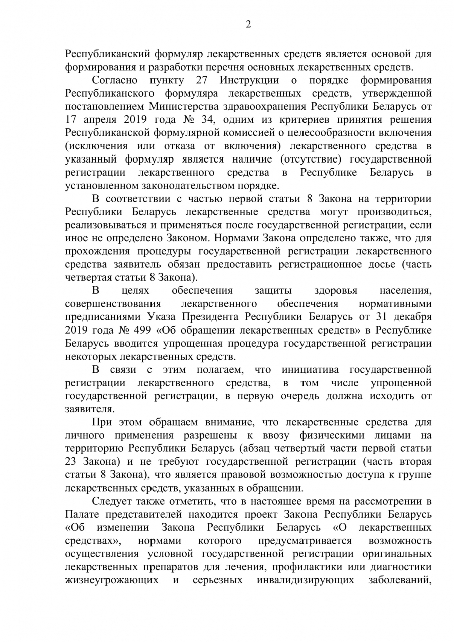 Палата представителей Национального собрания Республики Беларусь обратилась в Совет Министров Республики Беларусь с просьбой поручить дополнительно проработать вопрос регистрации патогенетических лекарственных средств, предусмотреть финансирование их дальнейшей закупки, а также изучить возможность импортозамещения.