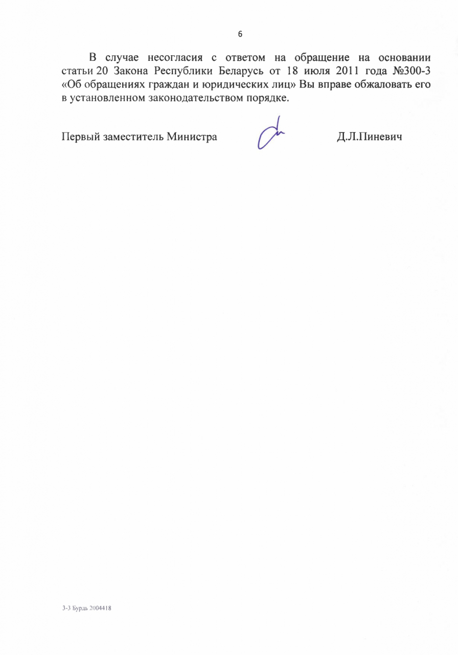 4) инициировать и осуществить надзор за точным и единообразным соблюдением прав пациентов со СМА на получение медицинской помощи в Республике Беларуси в соответствии с Законом Республики Беларуси от 18 июня 1993 г. № 2435-XII и Статьями № 159, 161, 162, 165 Уголовного кодекса Республики Беларусь.