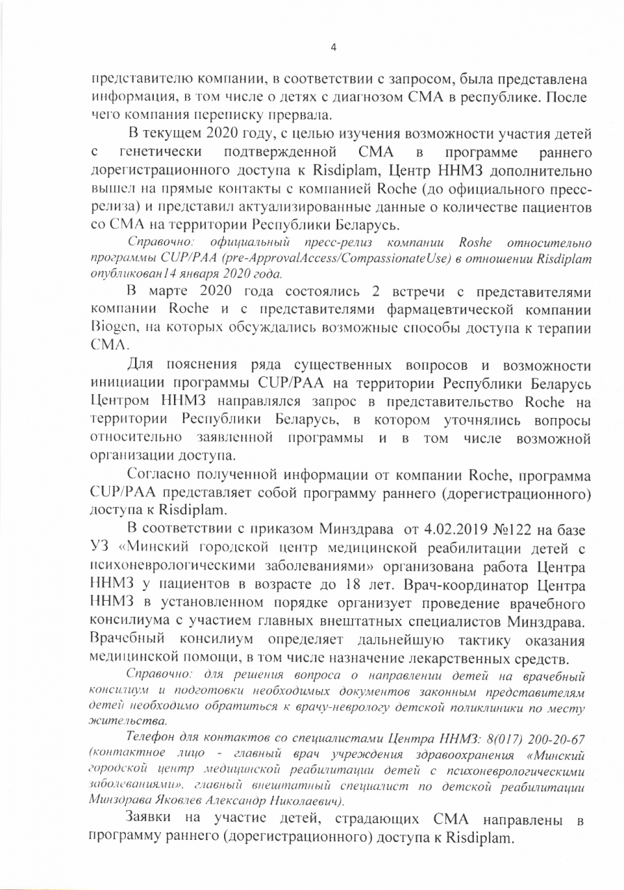 Единственный выход спасти граждан Республики Беларусь, больных СМА, — обеспечить всем им доступ к лечению массово, гарантированно и в любой возможной форме, включая программы расширенного доступа и клинические испытания.