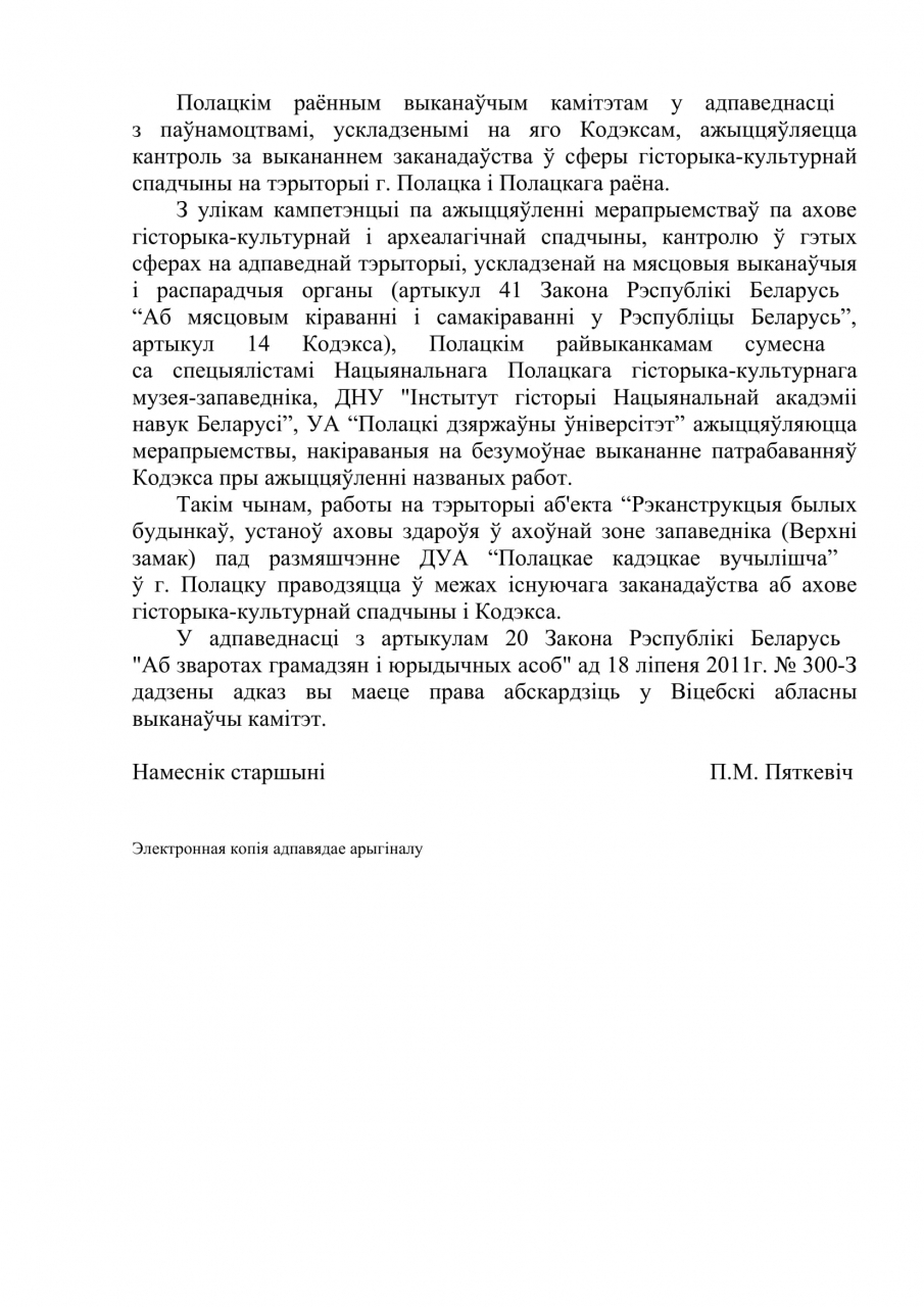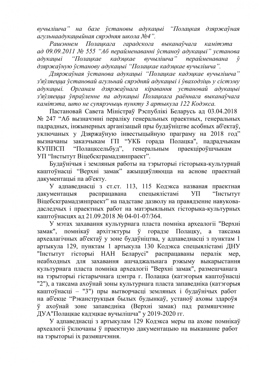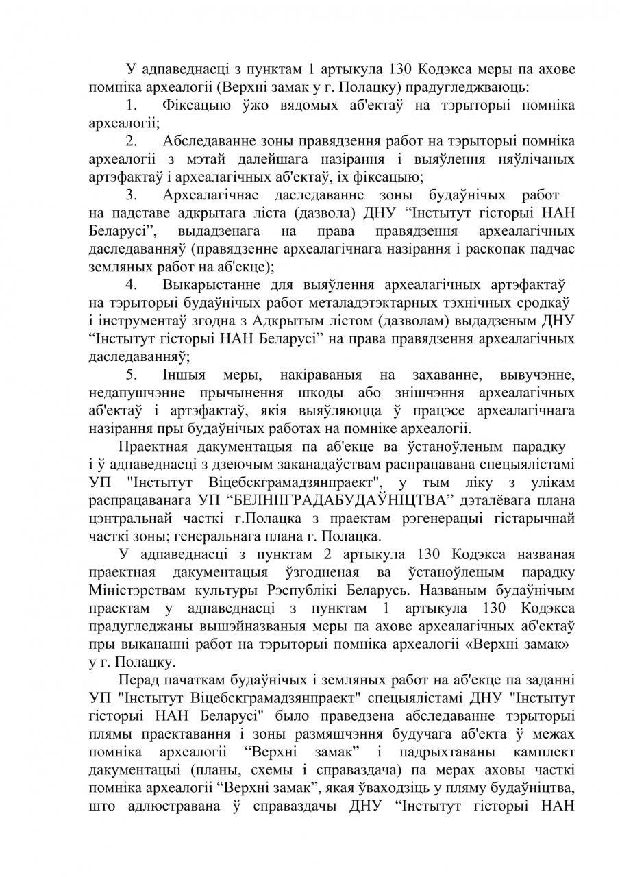 Работы на тэрыторыі аб'екта “Рэканструкцыя былых будынкаў, устаноў аховы здароўя ў ахоўнай зоне запаведніка (Верхні замак) пад размяшчэнне ДУА “Полацкае кадэцкае вучылішча” ў г. Полацку праводзяцца ў межах існуючага заканадаўства аб ахове гісторыка-культурнай спадчыны і Кодэкса аб культуры.