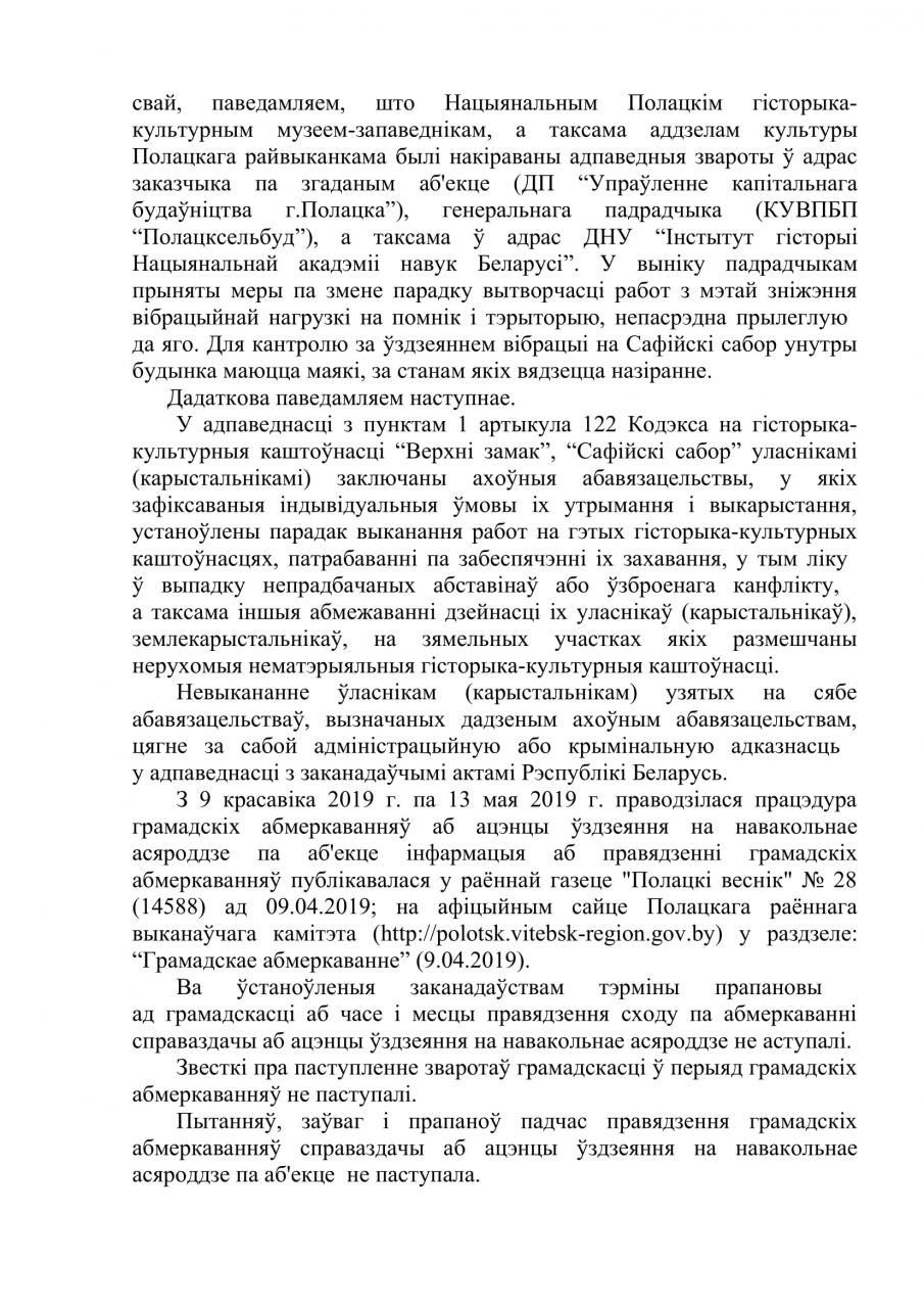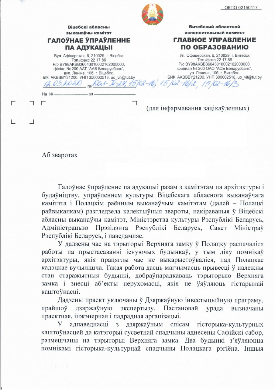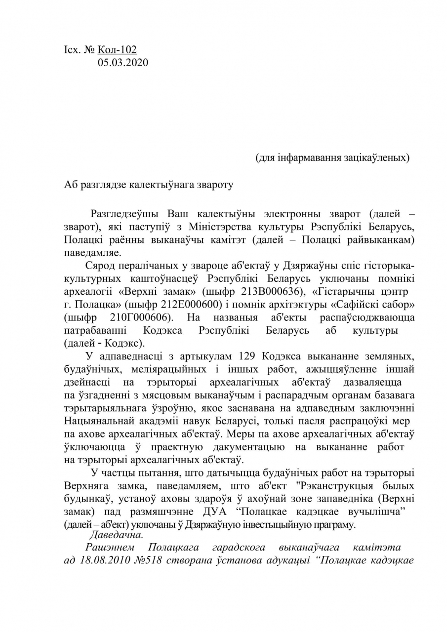 Работы на тэрыторыі аб'екта “Рэканструкцыя былых будынкаў, устаноў аховы здароўя ў ахоўнай зоне запаведніка (Верхні замак) пад размяшчэнне ДУА “Полацкае кадэцкае вучылішча” ў г. Полацку праводзяцца ў межах існуючага заканадаўства аб ахове гісторыка-культурнай спадчыны і Кодэкса аб культуры.