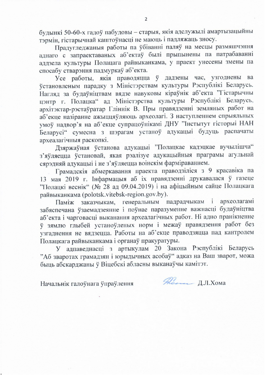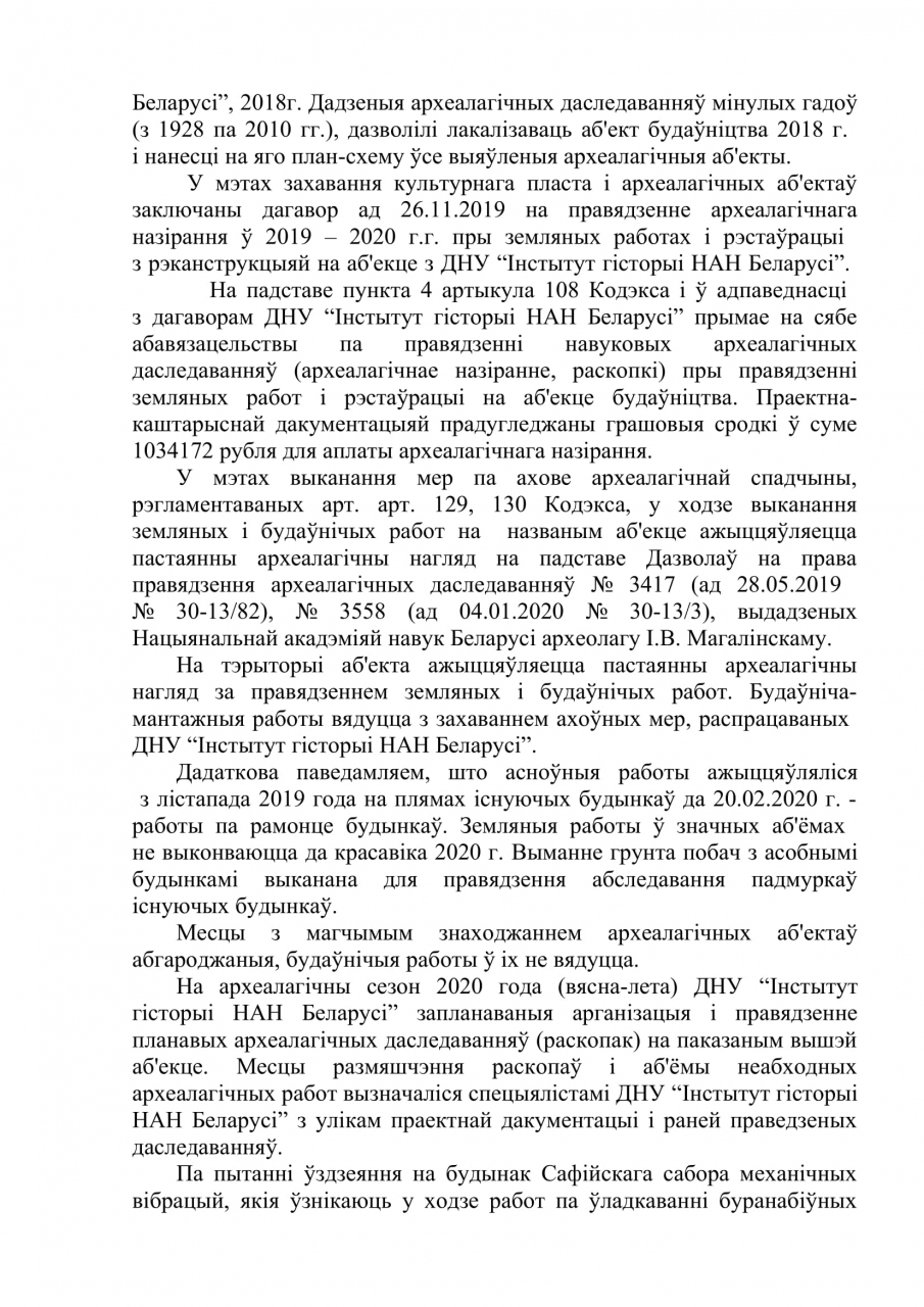 Паміж заказчыкам, генеральным падрадчакам і археолагамі забяспечана ўзаемадзеянне і поўнае паразуменне важнасці будаўнітва аб`екта і чарговасці выканання археалагічных работ. Ні адно пранікненне ў зямлю глыбей устаноўленых норм і межаў правядзення работ без узгаднення не вядзецца. Работы на аб`екце праводзяцца пад кантролем Полацкага райвыканкама і органаў пракуратуры.