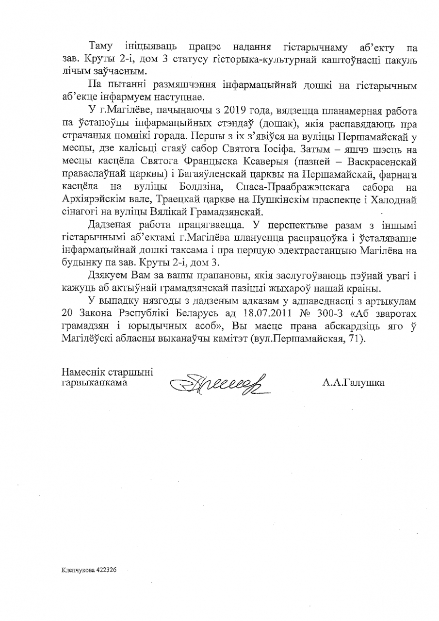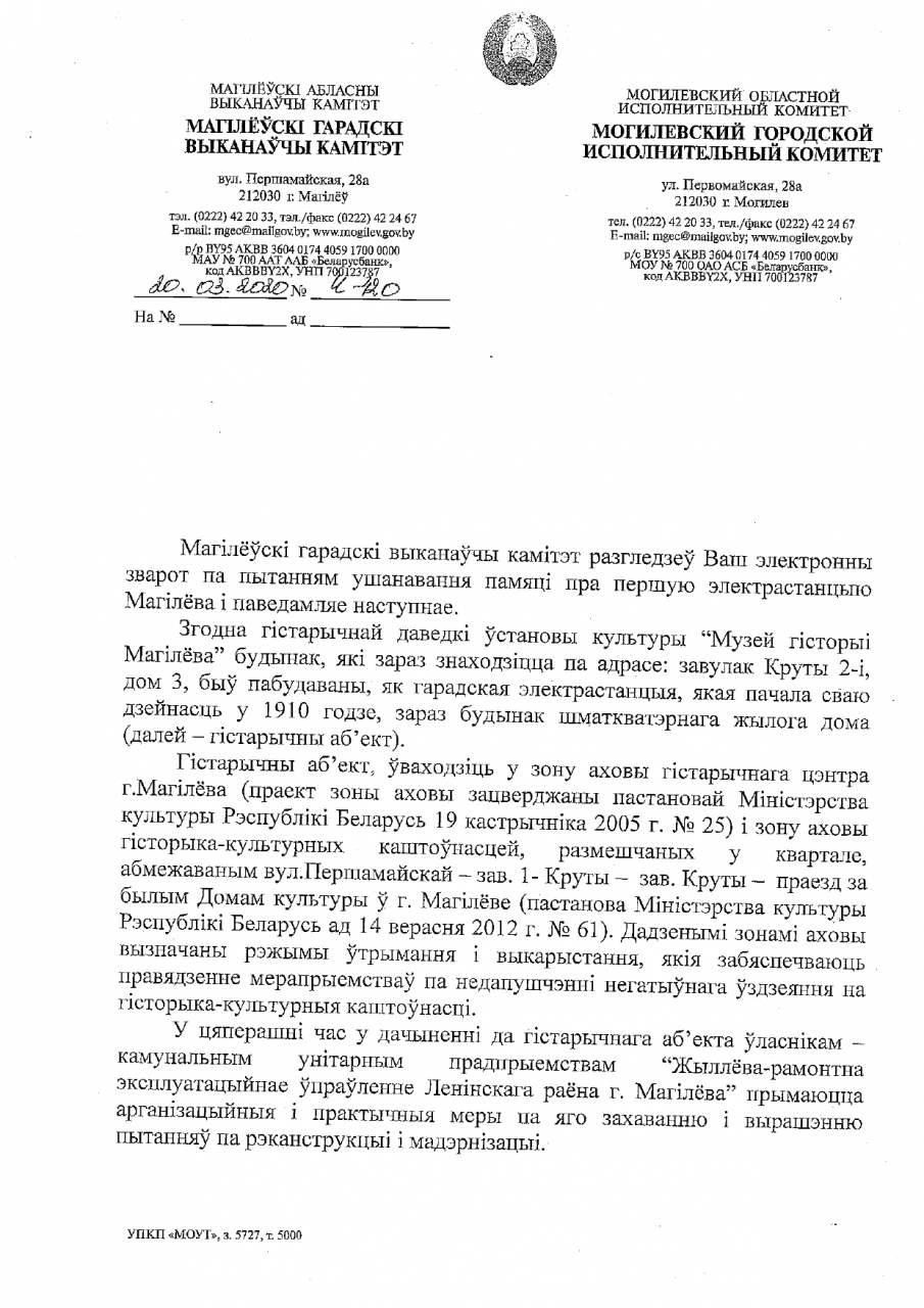У сувязі са 110-годдзем з пуска магілёўскай гарадской электрастанцыі просім Магілёўскі гарадскі выканаўчы камітэт распрацаваць і ўстанавіць на колішнім будынку першай электрастанцыі, які знаходзіцца па адрасе 2-і Круты завулак № 3, памятную дошку з інфармацыяй пра гэты гістарычны аб'ект, а таксама ініцыяваць працэс надання будынку статусу гісторыка-культурнай каштоўнасці. Пры магчымым правядзенні рэканструкцыі неабходна максімальна захаваць аўтэнтычныя канструкцыі і разгледзець магчымасць аднаўлення фасадаў на стан 1910 года або выявіць абодва перыяды існавання будынка (да і пасля рэканструкцыі).