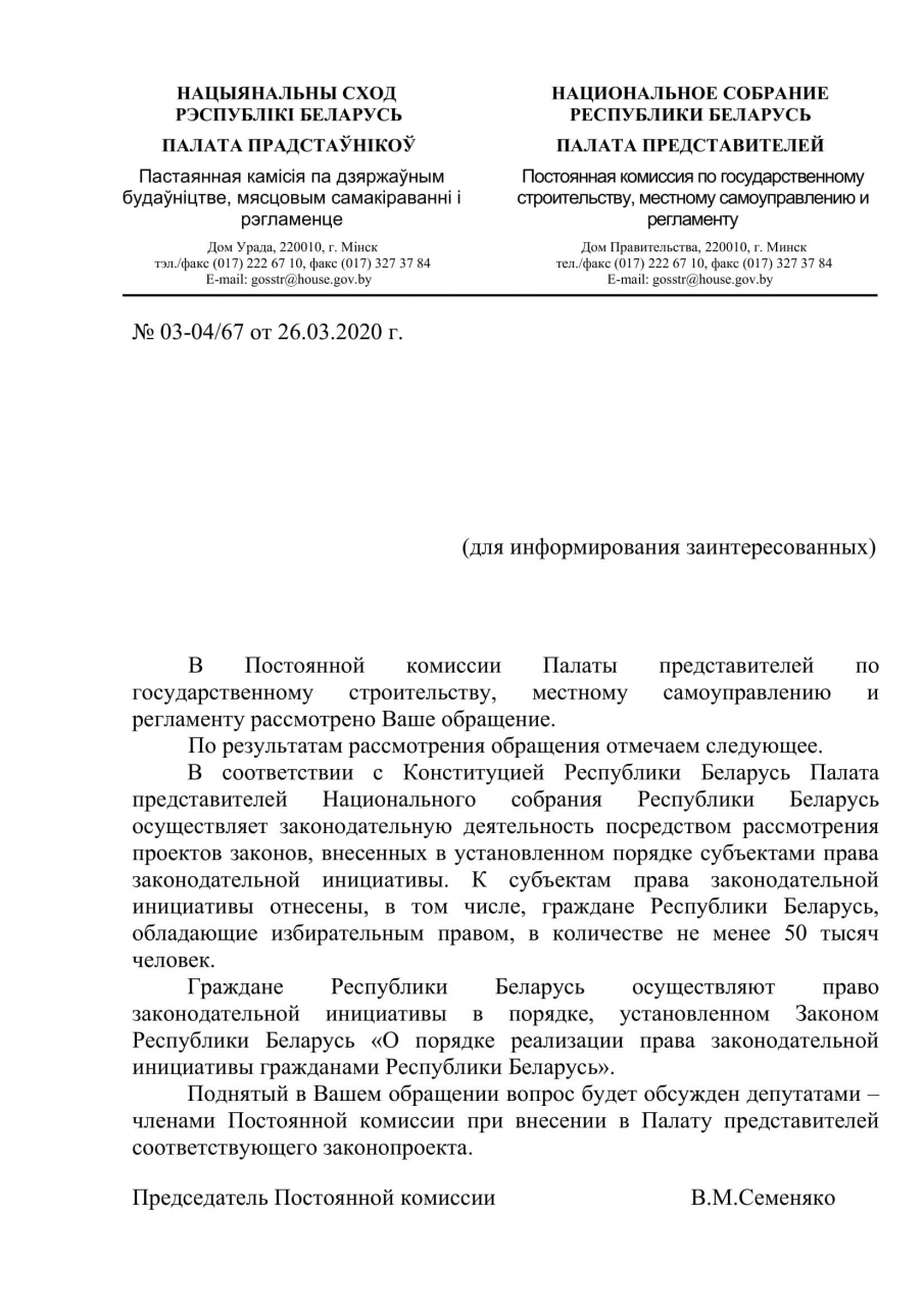 Поднятый в обращении вопрос будет обсужден депутатами – членами Постоянной комиссии при внесении в Палату представителей соответствующего законопроекта.