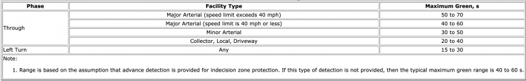 Как можно наблюдать в этой таблице максимально допустимое значение является 70 секунд, которое применяется для магистральных улиц с ограничением скорости более 40 миль в час (~64 километра в час).