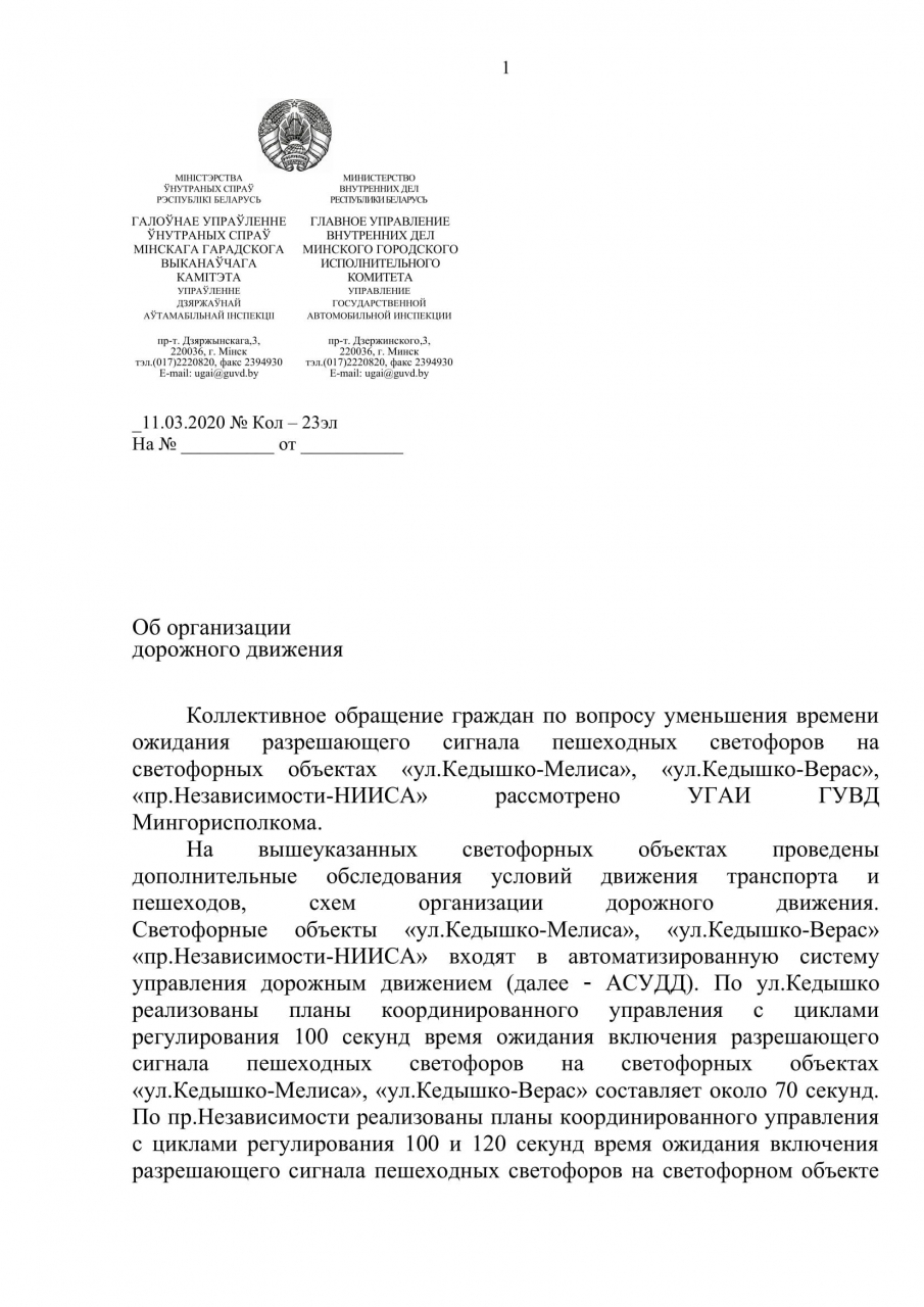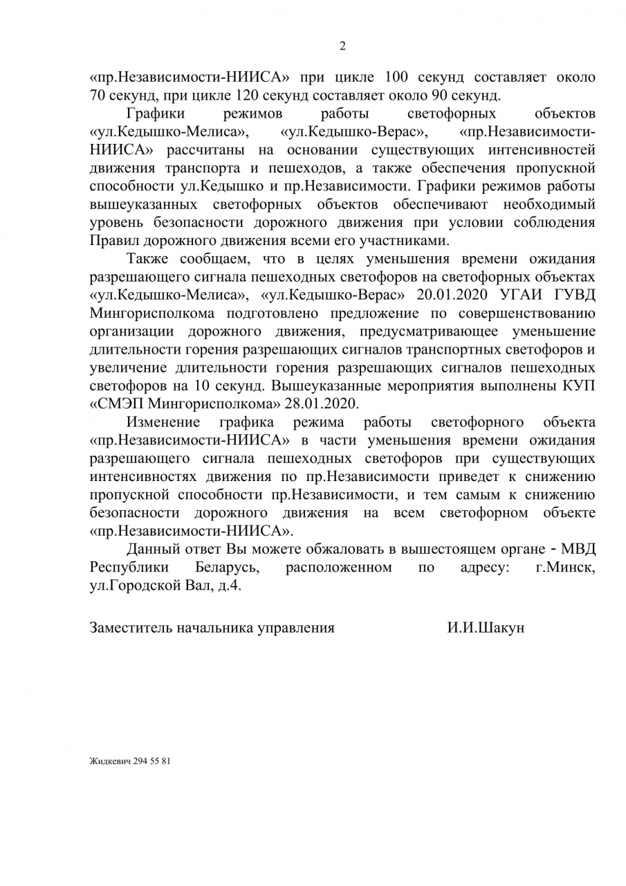 В связи с вышеизложенным, руководствуясь пп 17.7 п.7 Положения о Государственной автомобильной инспекции Министерства внутренних дел Республики Беларусь, который устанавливает, что одной их основных функций ГАИ является, в том числе, изучение условий дорожного движения, принятие мер к совершенствованию организации движения транспорта и пешеходов, согласование в установленном порядке проектов организации дорожного движения в городах и на дорогах, требуем сократить время ожидания для пешеходов до 45 секунд на переходах по ул.Кедышко и до 60 секунд на переходе возле остановочного пункта “Обсерватория”.