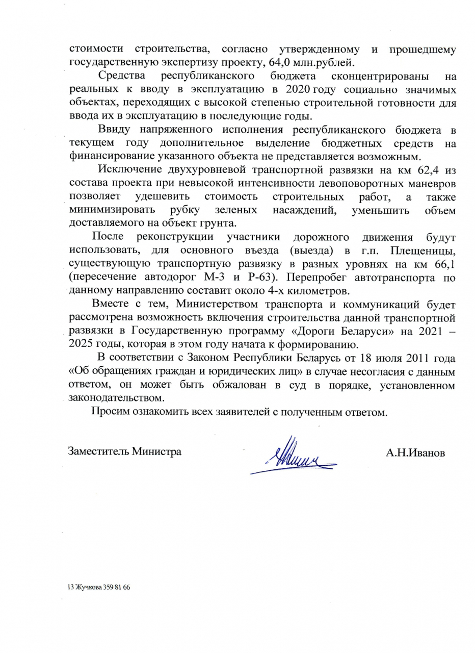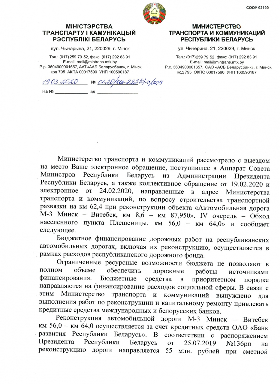В октябре 2019 года началась реконструкция автодороги М3 с 56 по 64 километр по нормативам 1 категории. Изначально проект предусматривал развязку на 62 км для поворота в Плещеницы. Также, когда проходили общественные обсуждения, перед реконструкцией данной дороги, то развязка присутствовала в данном проекте, однако, в ходе строительства она исчезла. Вместо развязки в целях удешевления стоимости проекта при движении автомобилей из Минска хотят запретить поворот в Плещеницы, поставить барьерное ограждение и пустить весь транспорт в объезд, что увеличит расстояние на 5 км. Более 50% жителей Плещениц работают в г.Логойске и г.Минске и из-за увеличения расстояния до Плещениц каждому из них в год придётся проезжать лишние 1000 км. Увеличение расстояния до Плещениц скажется на подорожании всех видов товаров и транспорта, что ухудшит материальное положение граждан. В совокупности прямой годовой ущерб гражданам из-за объезда будет значительно выше стоимости развязки.