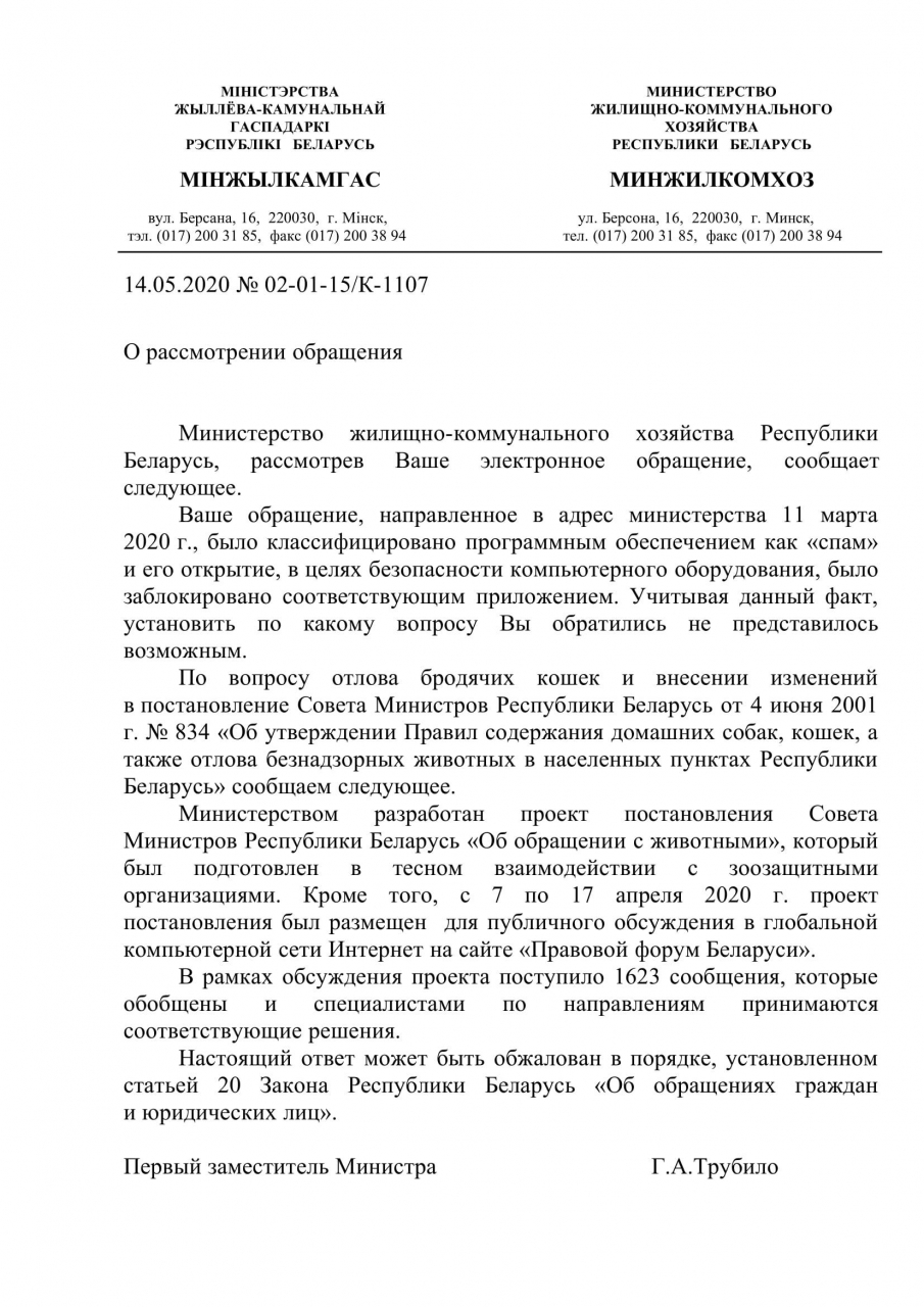В связи с готовящейся в Минжилкомхозе и Совете Министров новой редакции Постановления №834 от 4 июня 2001 «Об утверждении Правил содержания домашних собак, кошек, а также отлова безнадзорных животных в населенных пунктах Республики Беларусь», просим Вас включить в это Постановление пункт о прекращении отлова дворовых кошек и введения стерилизации кошек, от которых отказались владельцы.