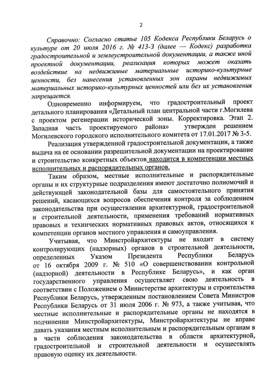 В связи с несоответствием планируемого многоэтажного жилого разработанному ПДП центральной зоны Могилёва и проекту зон охраны исторического центра г.Могилёва, градостроительном и визуальном значении участка, на которым его планируется возвести, угрозой целостности и сохранности зданию, являющемуся историко-культурной ценностью 3-й категории, просим Министерство архитектуры и строительство настойчиво рекомендовать Могилёвскому горисполкому либо отказаться от планов возведения жилого дома, либо требовать проведения общественного обсуждения с предоставлением графической части (схема размещения, общие виды).