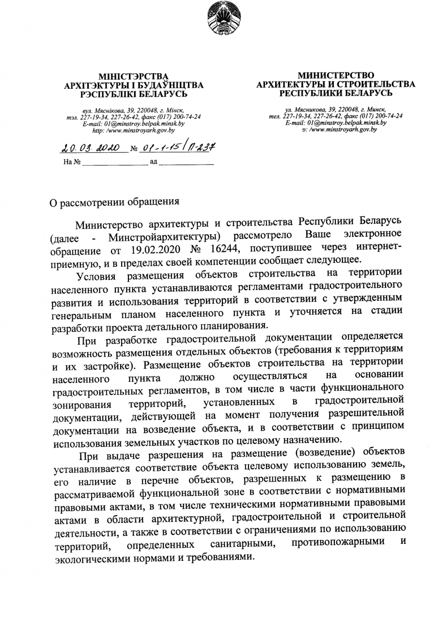 Также сообщалось, что до 07.02.2020 решение Могилевского горисполкома о разрешении проведения проектно-изыскательских работ и строительства объекта «Многоквартирный жилой дома по ул. Лазаренко в г. Могилеве» (3-я и 4-я очереди строительства) не принималось.