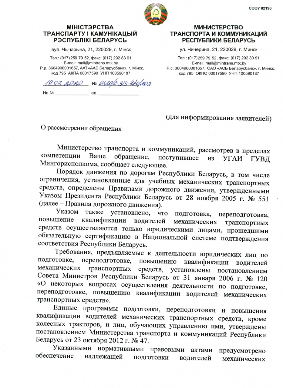 Хотели бы заострить внимание на учебном транспорте в утренние часы пик. Мало того, что в утреннее время много машин и пробок в Минске, поскольку люди спешат на работу и боятся опоздать во избежание наказания за опоздание, так ещё и некоторые ученики автошкол на учебном транспорте создают аварийные ситуации на дороге и тормозят движение, в связи с чем огромная просьба запретить выезд учебного транспорта автошкол на городские дороги общего пользования в утренние часы пик до 9:00.
